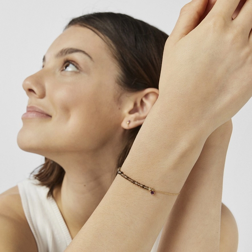 Браслет TOUS Cool Joy из 18-каратного золота с дымчатым кварцем 3-4 мм и родолитами 3 мм. Застежка-пусет. Длина браслета: 17,5 см.
