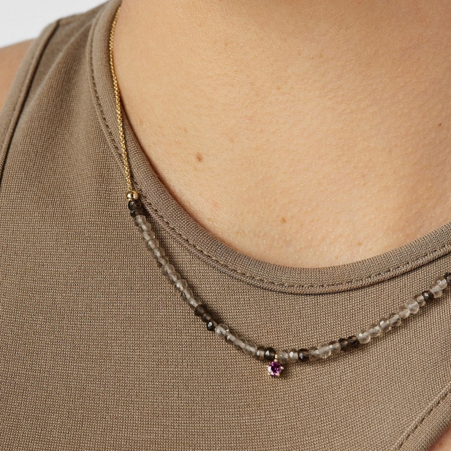 Ожерелье TOUS Cool Joy из 18-каратного золота с дымчатым кварцем 3-4 мм и родолитами 3 мм. Шпрингельный замок. Длина ожерелья: 45 см.