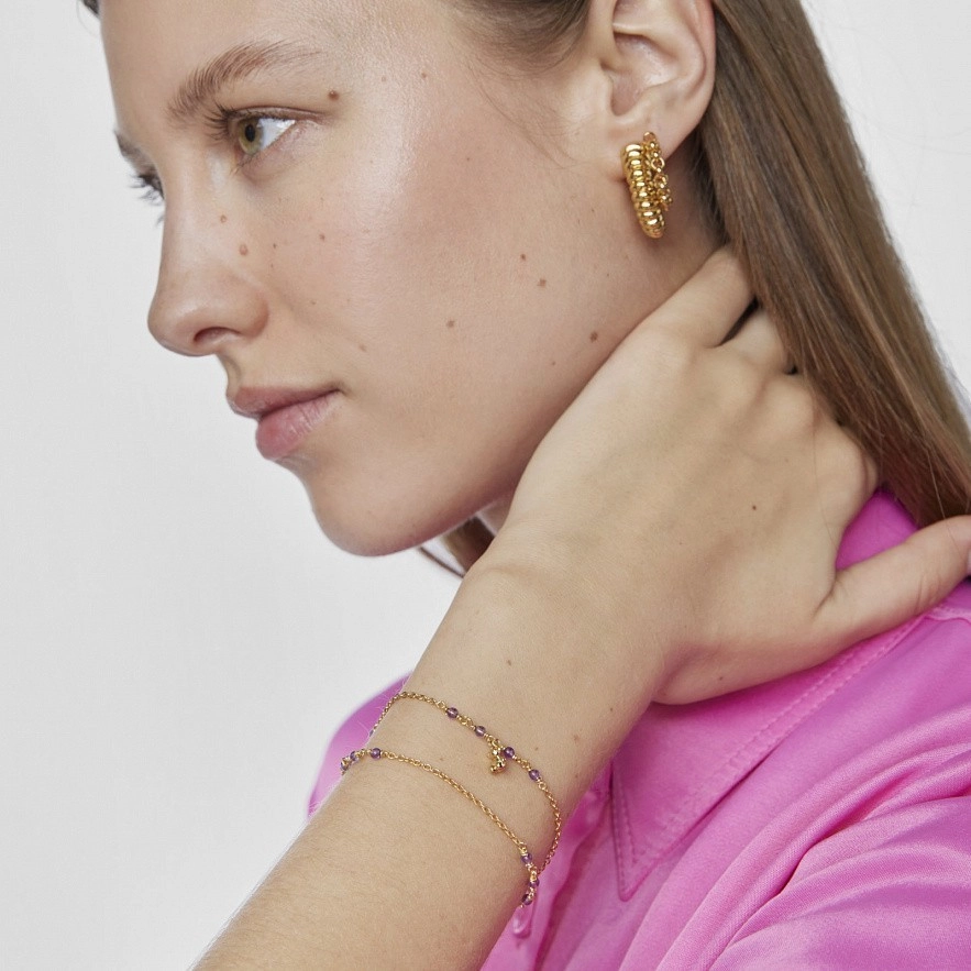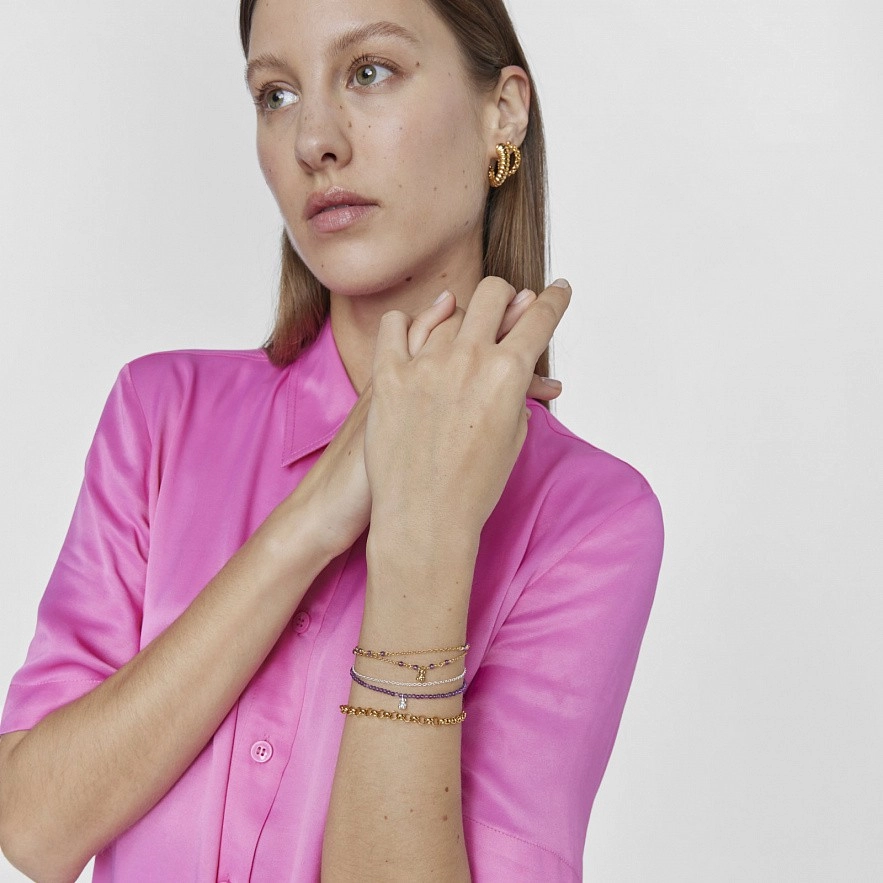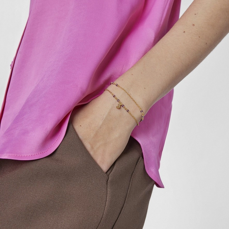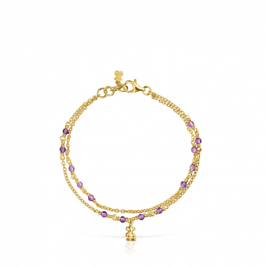 TOUS Bold Bear браслет из серебра 925 пробы с покрытием Vermeil и аметиста, состоящий из двух цепочек, соединенных на концах, одна из них с подвеской в виде медведя из серебра 925 пробы с покрытием Vermeil . Размер драгоценных камней: 2-2,5мм. Размер медведя: 5,35мм. Длина браслета: 17,5 см. Застежка-лобстер.