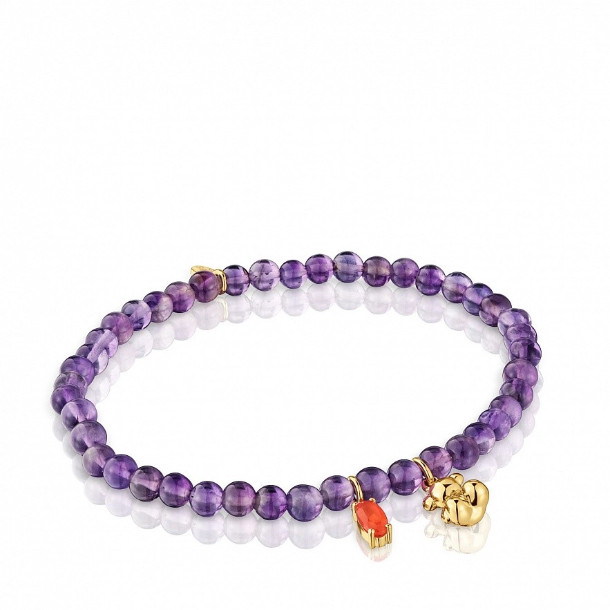 Эластичный браслет TOUS Bold Bear из серебра 925 пробы с покрытием Vermeil с аметистом и граненым овальным сердоликом. Размер аметиста: 4мм. Размер сердолика: 6 х 3 мм. Размер мишки: 8 мм. Длина браслета: 16,5 см. Браслет изготовлен из стерлингового серебра 925 пробы, покрытого золотом 18 карат толщиной от 3 до 5 микрон. Это качество гарантирует большую долговечность драгоценности.