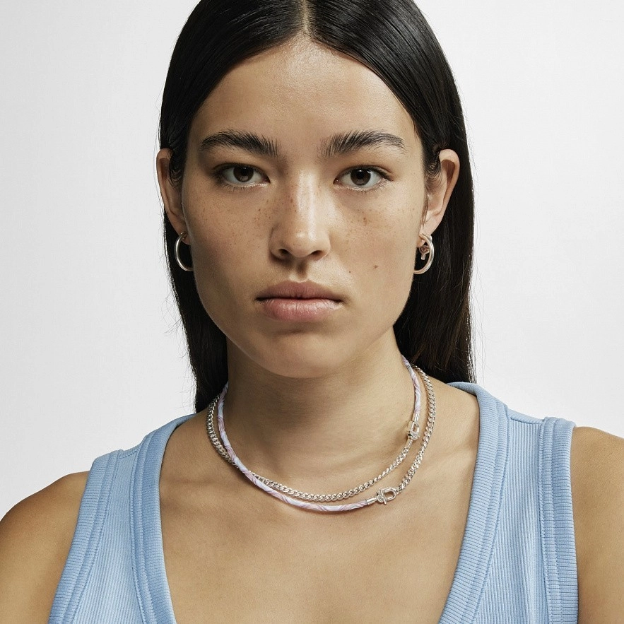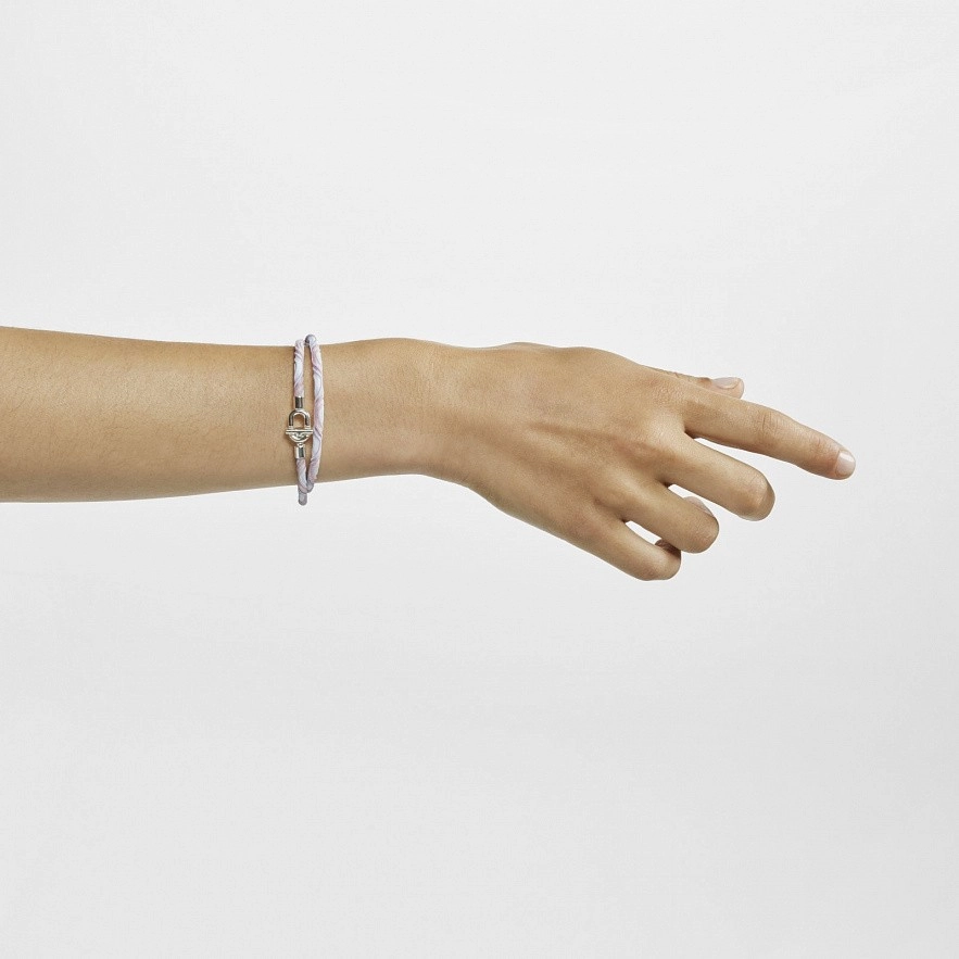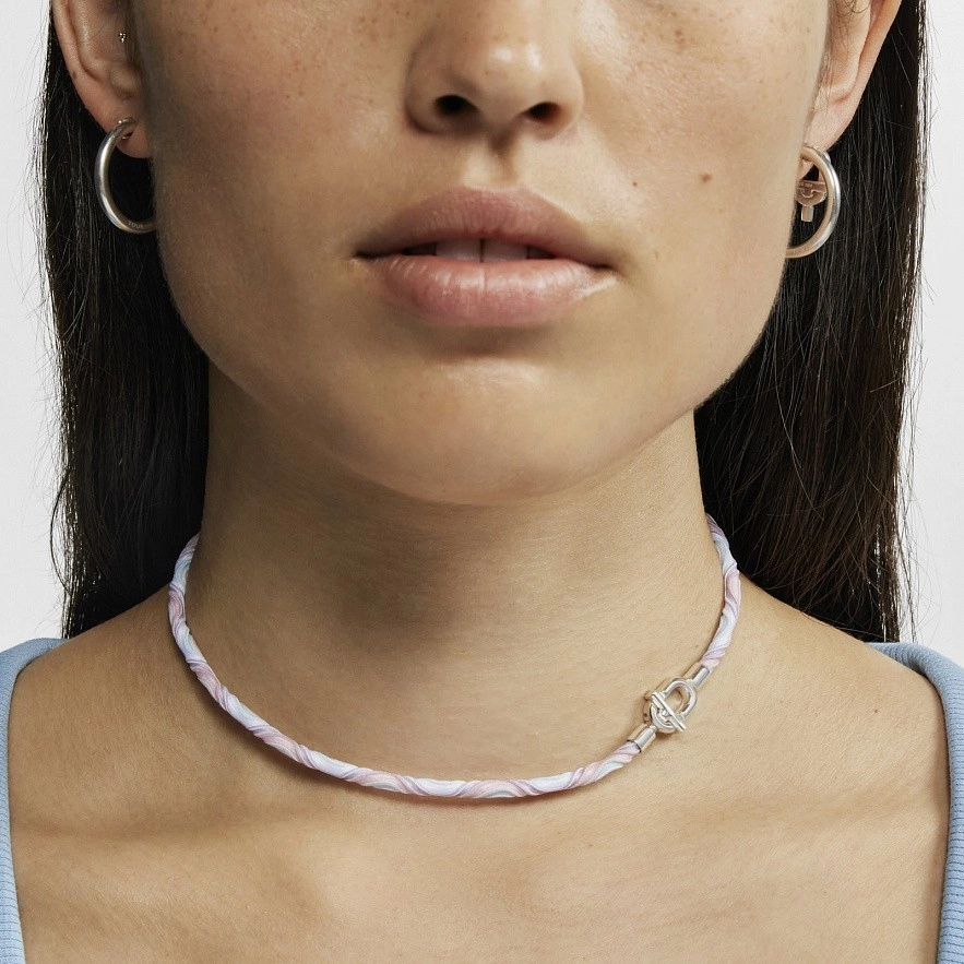 Колье TOUS Manifesto из серебра 925 пробы с розово-голубым эластичным шнуром. Диаметр шнура: 3,5 мм. Специальная застежка TOUS MANIFESTO. Размер застежки: 16,4х9,75 мм. Длина ожерелья: 38 см. Примечание: универсальное изделие, которое можно носить как колье, прикрепив другие предметы с помощью застежки TOUS Manifesto, и как двойной браслет.