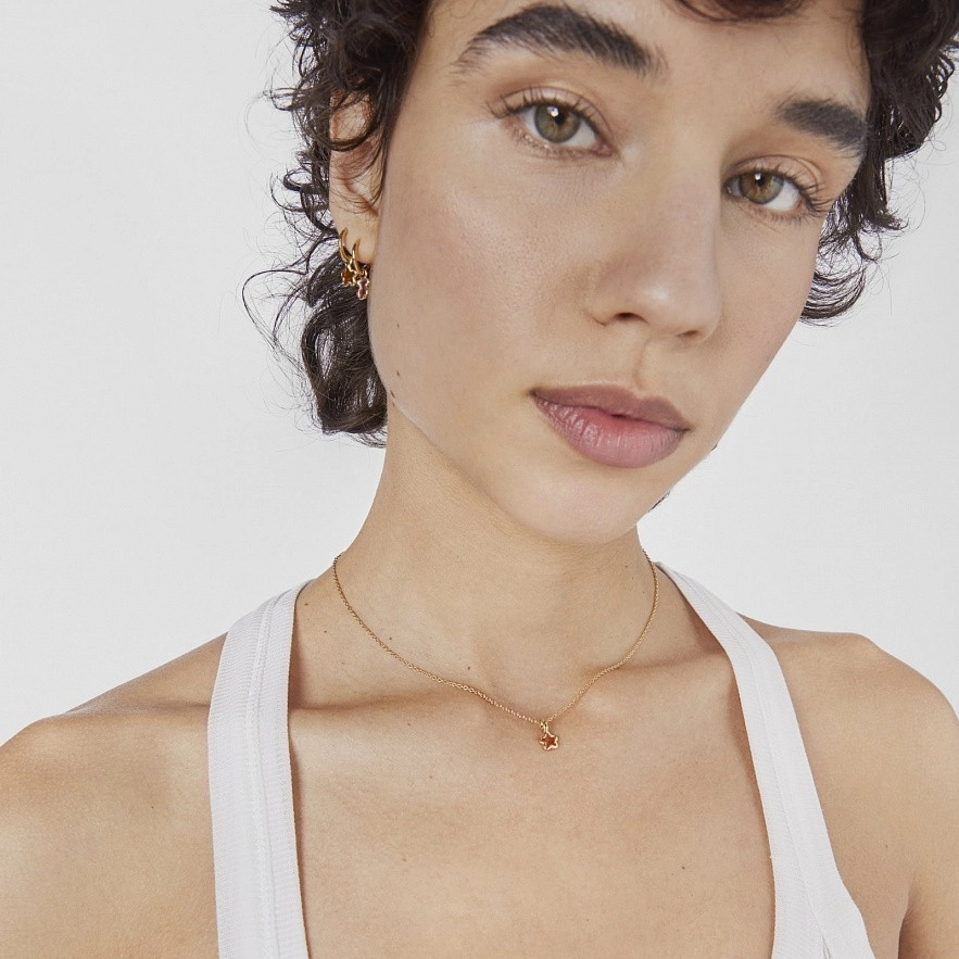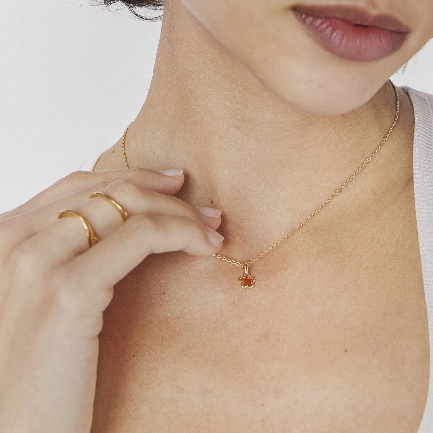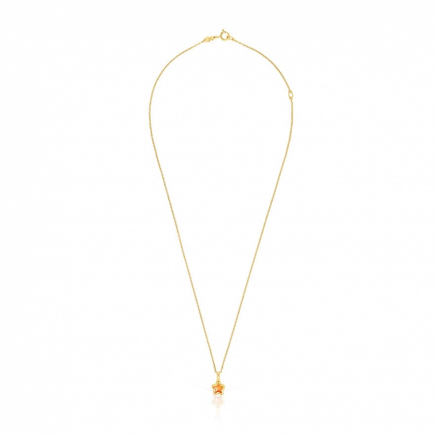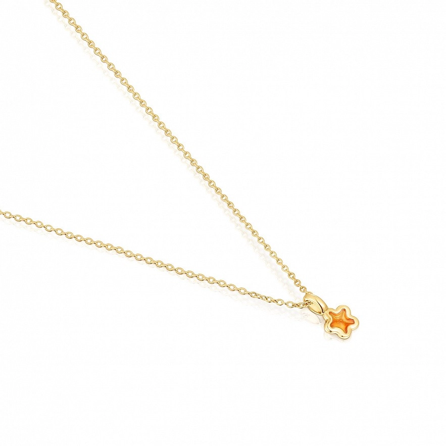 Колье TOUS Gregal из серебра 925 пробы с покрытием Vermeil и с мотивом кулона-звезды с оранжевой эмалью внутри и силуэтом из серебра 925 пробы с покрытием Vermeil . Размер мотива: 7×7,2 мм. Длина колье: 40-45 см. Пружинная застежка-кольцо.