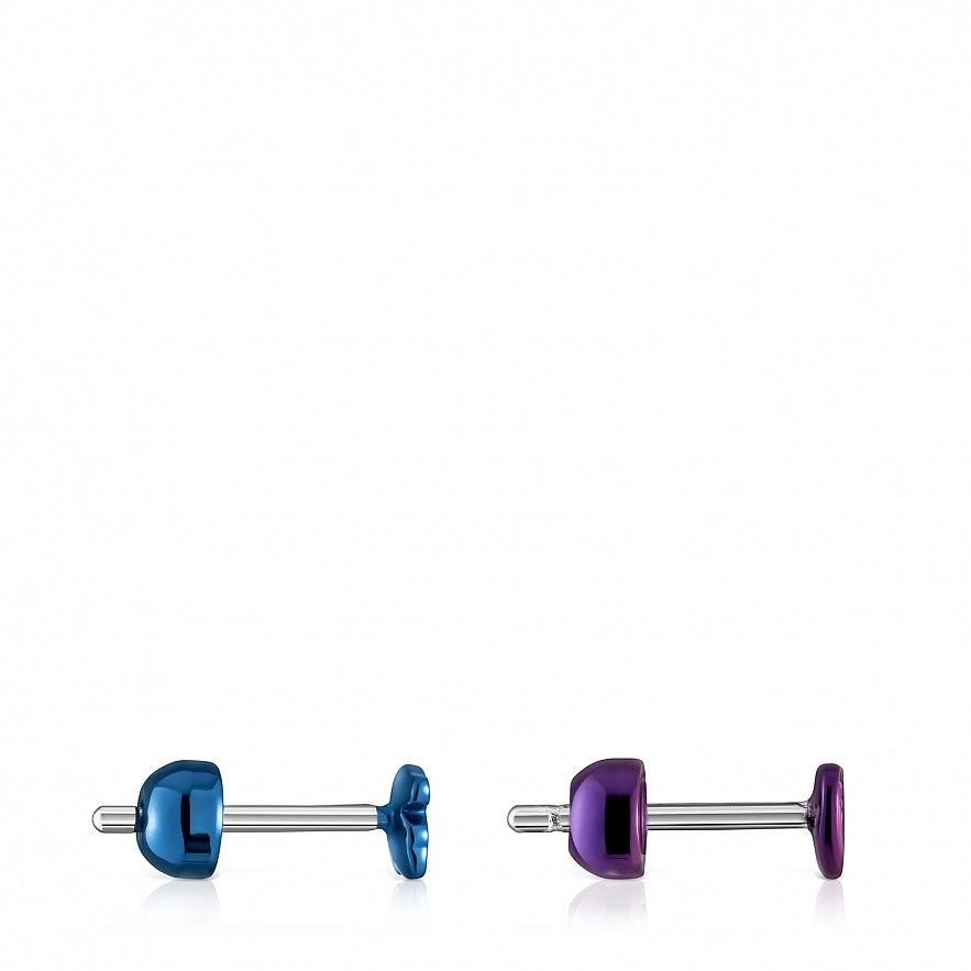 Набор из двух пирсингов для ушей TOUS Bickie из фиолетовой IP-стали с сердечком и синей IP-стали с мишкой. Длина стержня: 10 мм. Застежка-пусет.