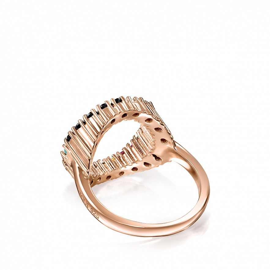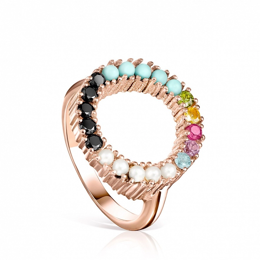 Кольцо с диском TOUS Straight из розового Vermeil с бирюзой, цаворитом, оранжевым сапфиром, рубином, аметистом, голубым топазом, жемчугом и шпинелями. Размер диска: 1.6 см. Вермель – слой золота 18 карат минимальной толщины 2,5 микрон на серебре высшей пробы, без каких-либо промежуточных слоев.