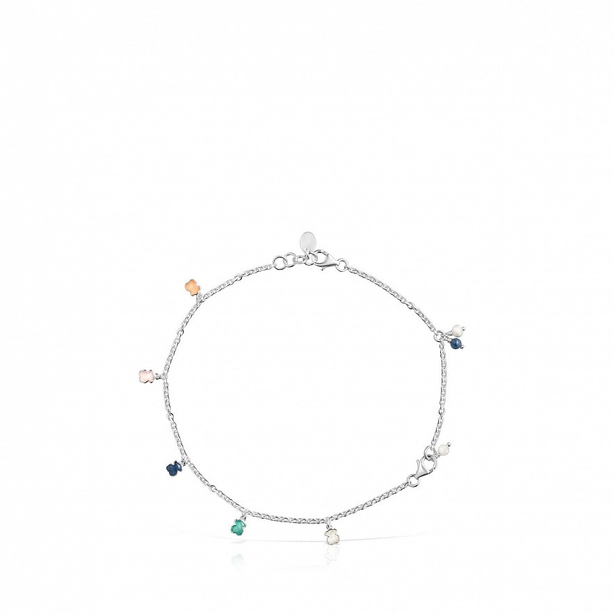 Браслет на руку или ногу TOUS Mini Color из серебра высшей пробы с 5 медвежатами из оранжевого кварцита, розового кварцита, кварца с дюмортьеритом, амазонита, перламутра и жемчуга. Удлинитель 8,5 см для ношения на ноге. Длина: 17,5–26 см.