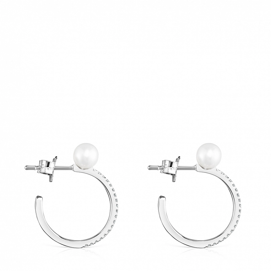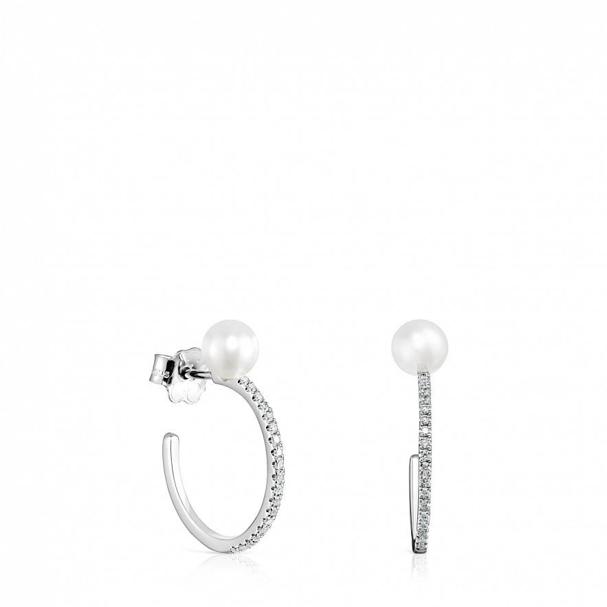 Серьги TOUS Les Classiques из белого золота 18 карат с бриллиантами и жемчужиной 0,6 см в форме кольца. Общий вес: 0.17 ct. Размер: 1,8 см.