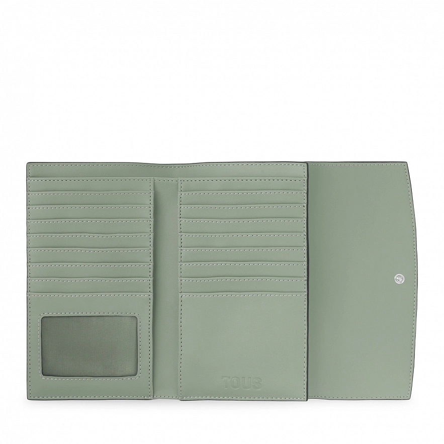 Гаманець на клапані TOUS Lucia з поліуретану темно-сірого кольору. Застібка на клапані та кнопці. Задня кишеня на блискавці для монет. Всередині три відкритих відділення для банкнот і шістнадцять слотів для карток. Розміри (висота х ширина х глибина): 11 х 19,50 х 2 см.