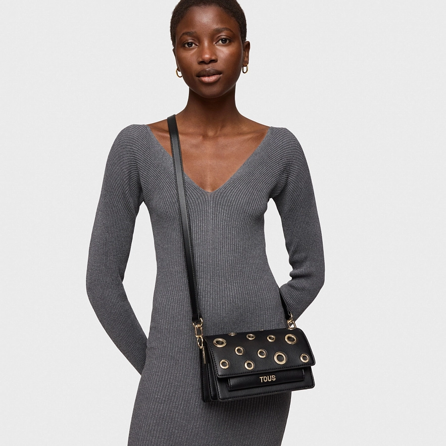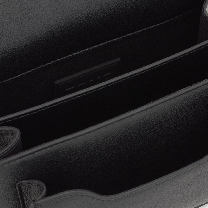Сумка TOUS Audree з поліуретану чорного кольору. Застібка на магнітних кнопках. Відкрита кишеня спереду і два відкритих відділення всередині. Знімний плечовий ремінь, регульований і знімний ремінь через плече. Розміри (висота х ширина х глибина): 12 х 20 х 10,5 см.