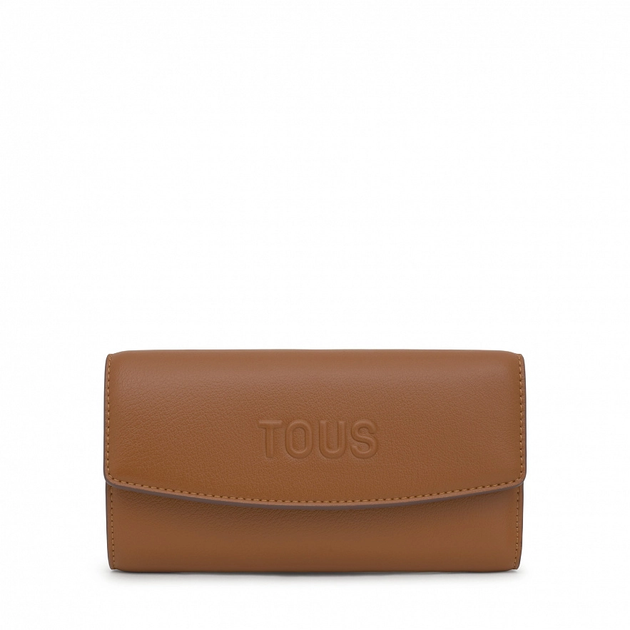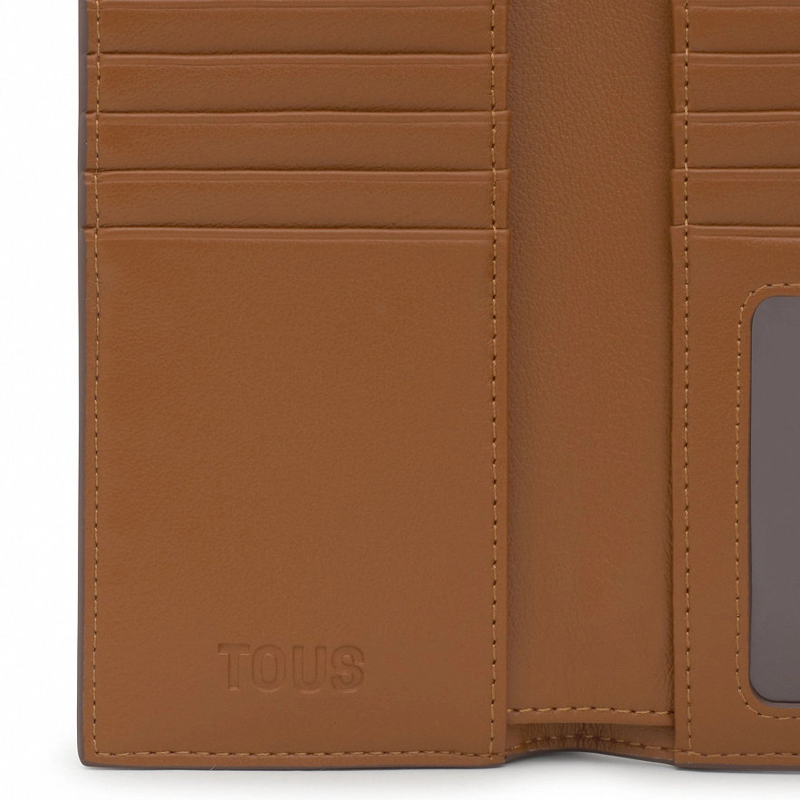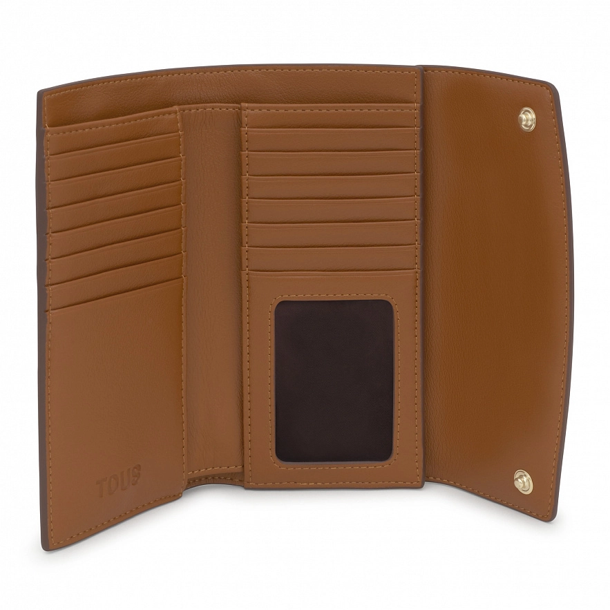 Гаманець TOUS Bloom з поліуретану, кольору кемел. Закривається клапаном на дві кнопки. Всередині дванадцять слотів для карток, один з яких прозорий, та відділення для купюр. Зовнішня кишеня на блискавці для монет. Розміри (висота х ширина х глибина): 10 х 18 х 2 см.