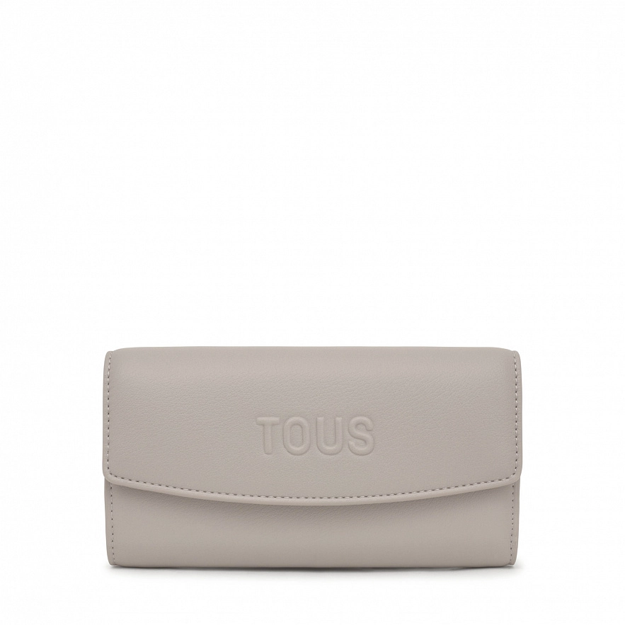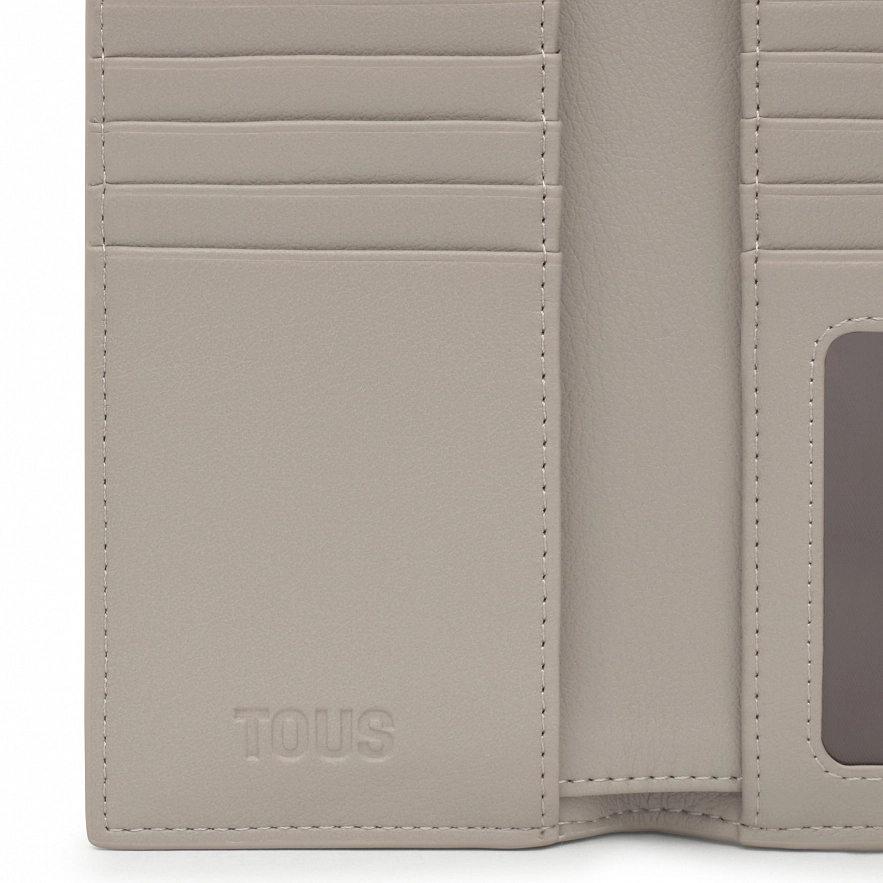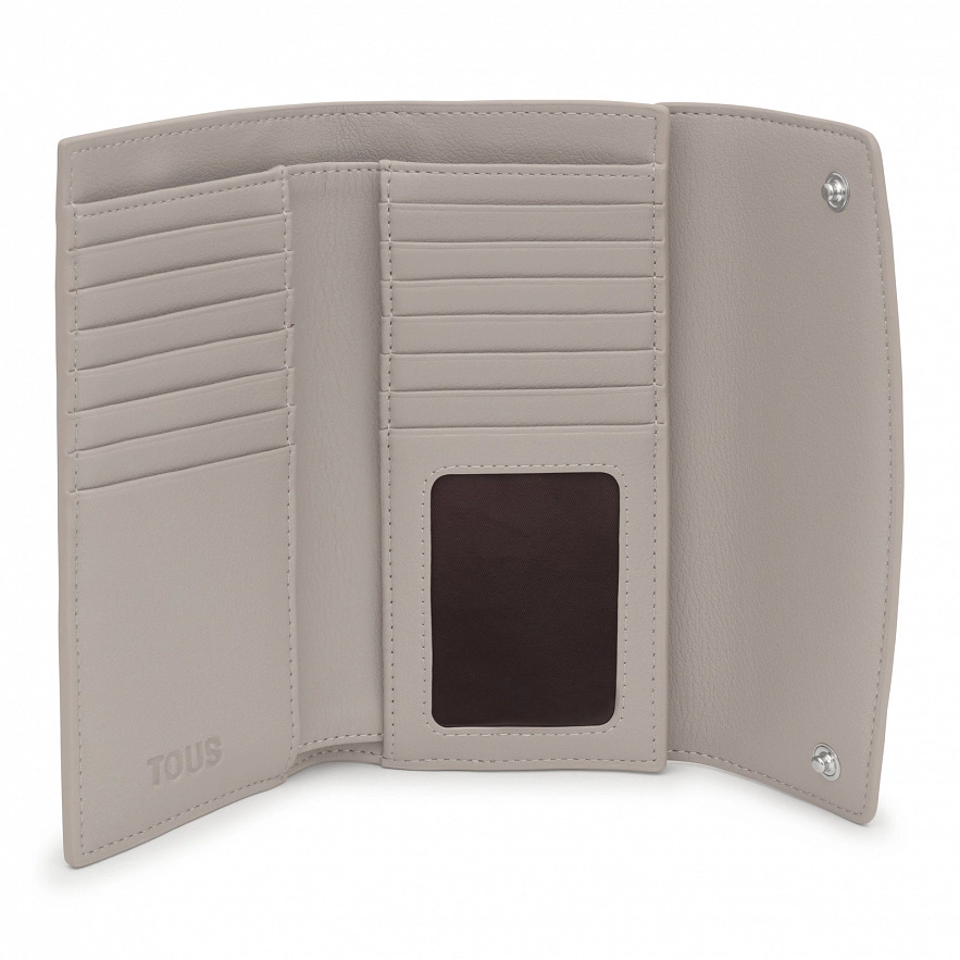 Гаманець TOUS Bloom з поліуретану, великий, сірого кольору. Закривається клапаном на дві кнопки. Всередині дванадцять слотів для карток, один з яких прозорий, та відділення для купюр. Зовнішня кишеня на блискавці для монет. Розміри (висота х ширина х глибина): 10 х 18 х 2 см.