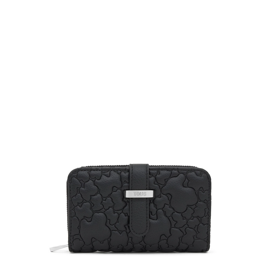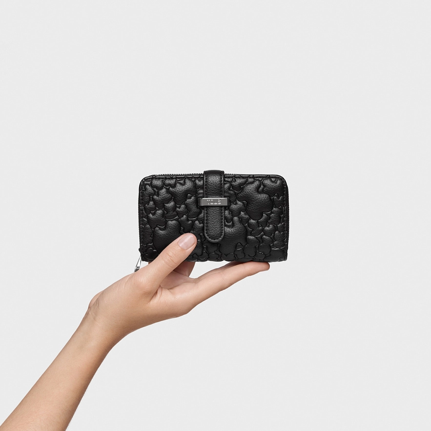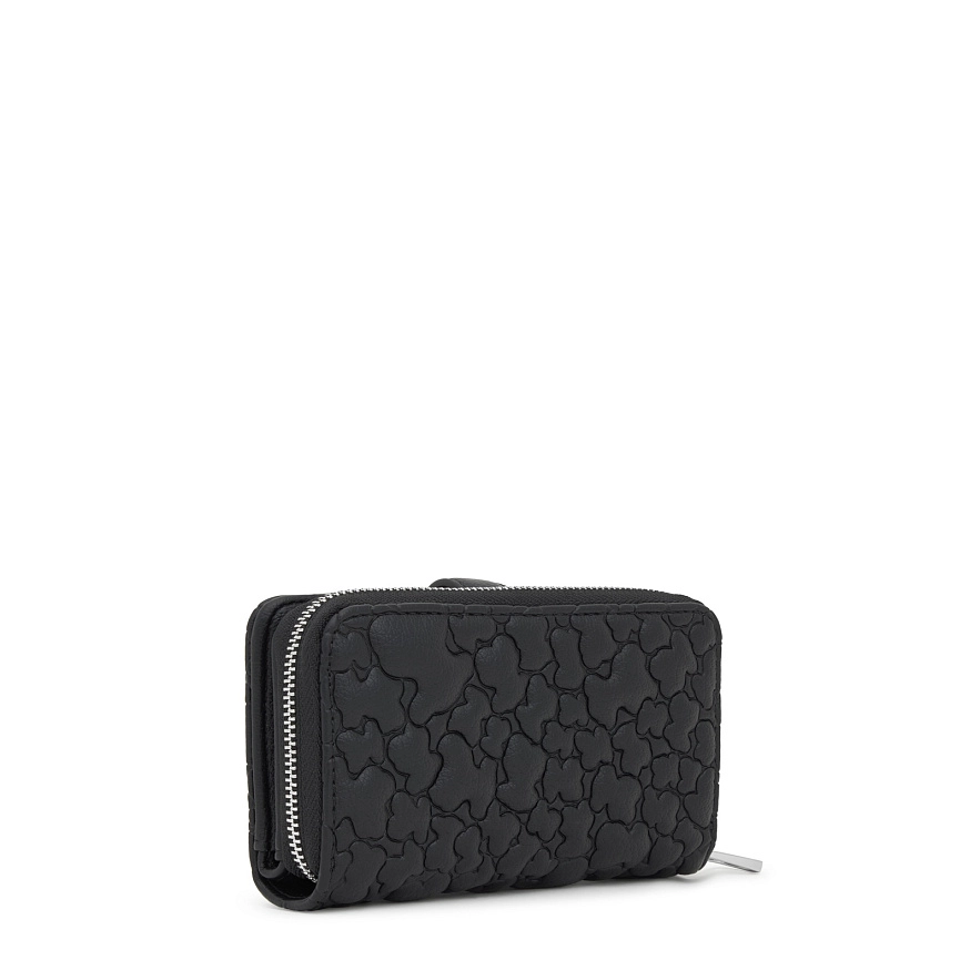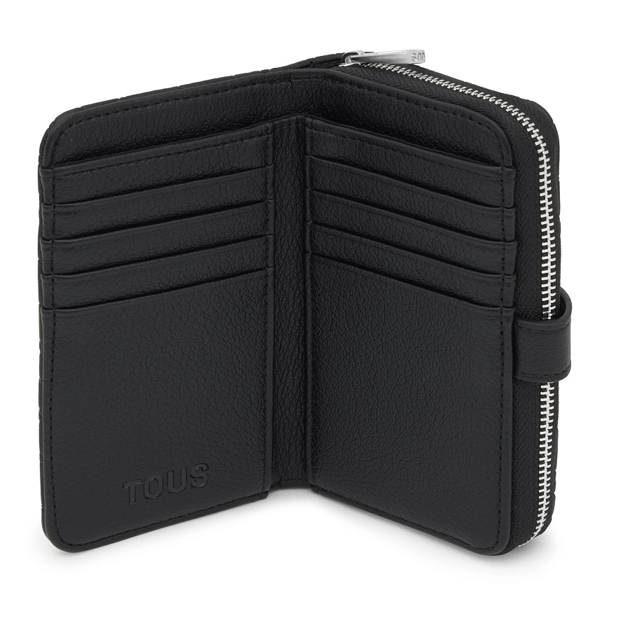 Гаманець TOUS Puffy Bear з чорного поліуретану. Застібається на кнопку та блискавку. Всередині має відділення для купюр, вісім слотів для карток та два відділення для монет. Розміри (висота х ширина х глибина): 9 х 13,5 х 3 см.