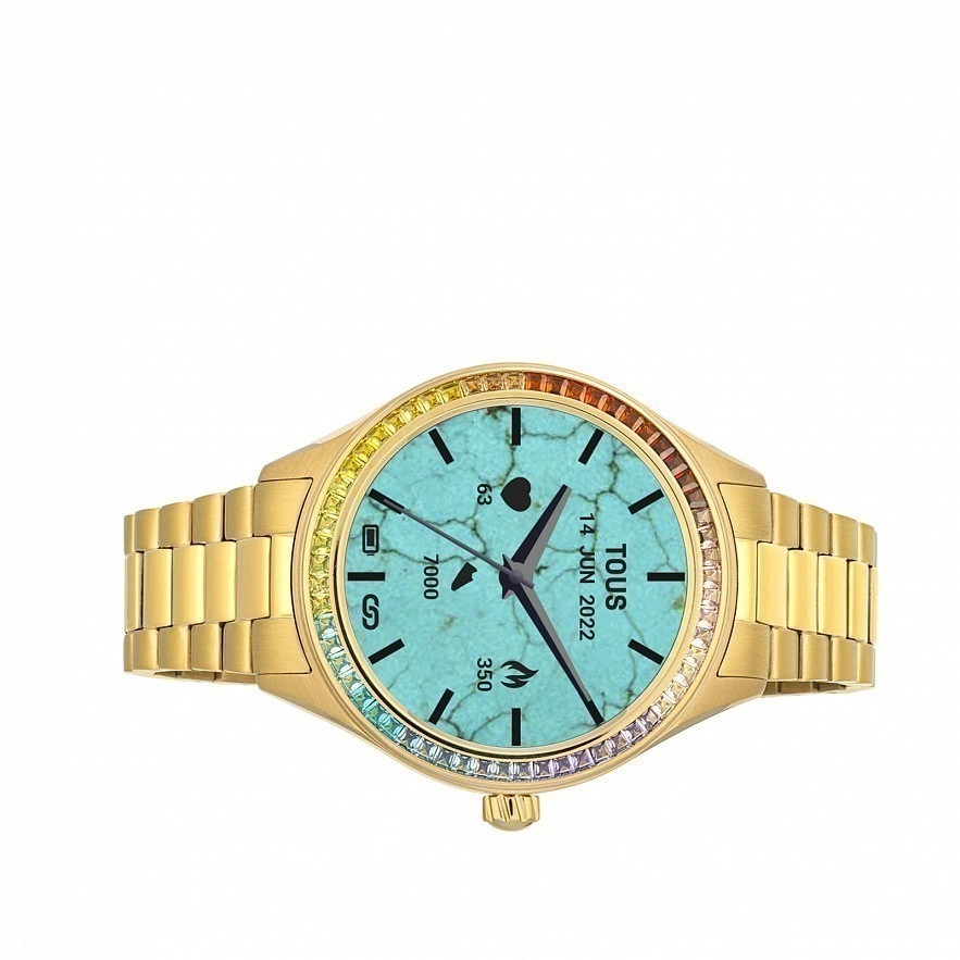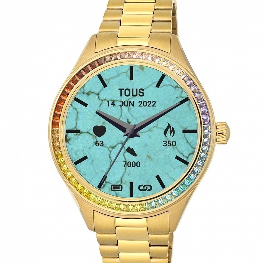 Безель із веселковими фіанітами в рейковій оправі. Сумісність: Android 7.0 і iOS 12.0 або вище. Сенсорний екран розміром 1,09 дюйма (Full Touch). Операційна система: RT OS. Підключення: версія Bluetooth: BT 5.0. RAM пам'ять: SRAM M4, 128 Mb Flash ROM. Батарея: 180 мАг, літієва акумуляторна батарея 3,7 В з магнітним кабелем, 5 днів у роботі та 10 у режимі очікування. Чіпсет/ЦП: Realtek RTL8762C-VD - ARM Cortex-M0 - швидкість 53 МГц. IP68 Водонепроникний. Функції: 12 циферблатів TOUS, зі змінним циферблатом із додатку TOUS WEAR APP, години, хвилини, секунди, місяць, день, день тижня, щоденна активність із лічильником кроків, лічильник калорій, пройдена відстань у милях або кілометрах, спорт (пішохідна ходьба), біг, скелелазіння, їзда на велосипеді, бігова доріжка, гребний тренажер, хіт, йога, фітнес, теніс і скакалка), вібраційний будильник, пульс, моніторинг сну, інформація про погоду, 1/100 секундний секундомір, 3 гри та сповіщення (дзвінки, WhatsApp, електронна пошта, SMS, Facebook тощо), керування музикою.