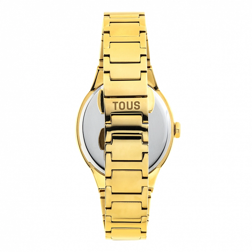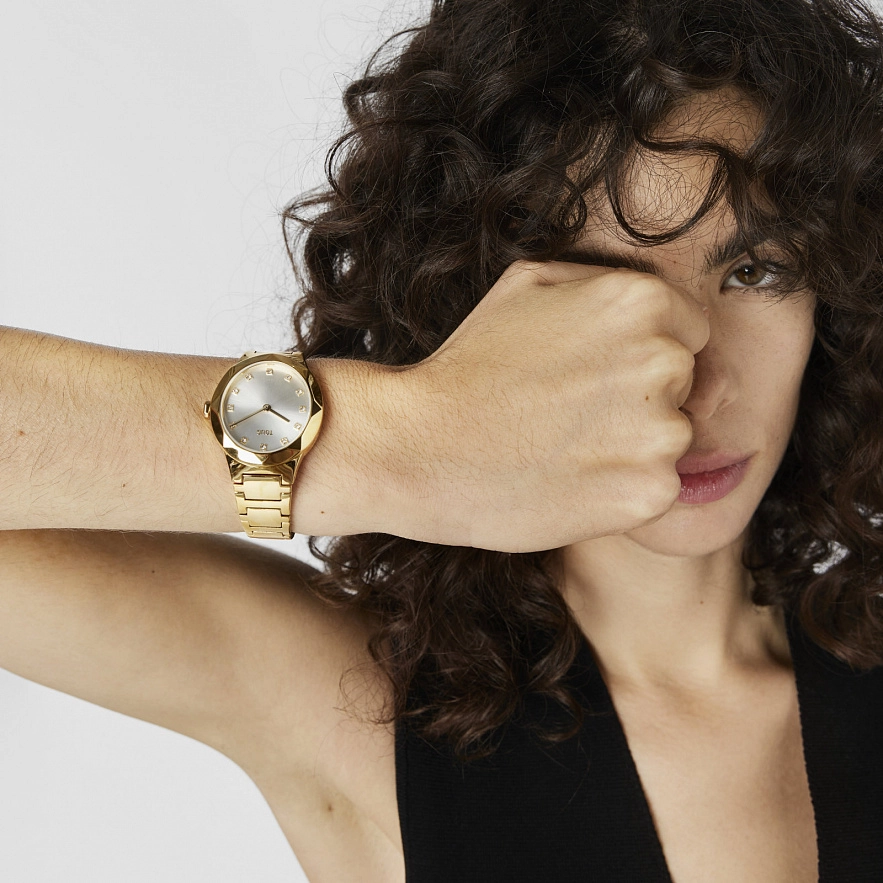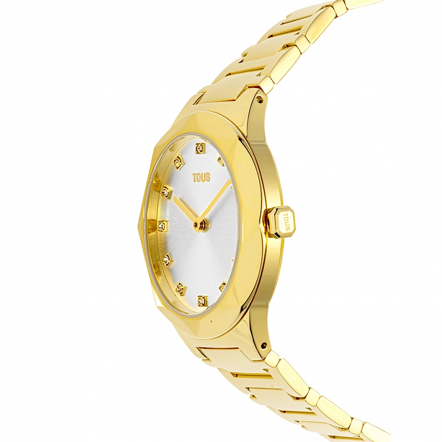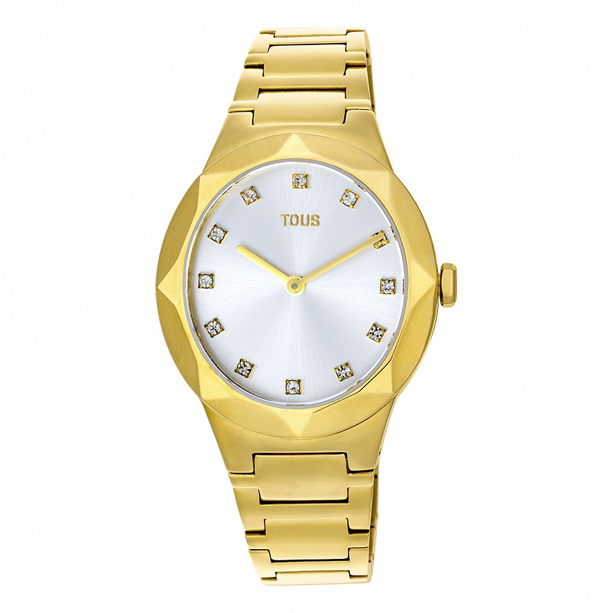 Годинник TOUS Karat Oval із золотистим ремінцем зі сталі IPG 316L, розміром 33 x 39 мм і металевим циферблатом з гранованими кристалами на цифрах. Функції: години та хвилини. Водонепроникність до 5 АТМ. Батарейка: 1,55 В, оксид срібла SR621SW / 0,30 г. Японський кварцовий механізм. Розкладна застібка з кнопками.
