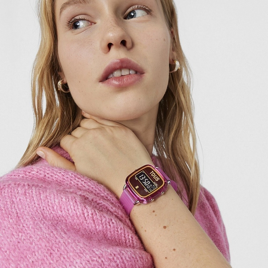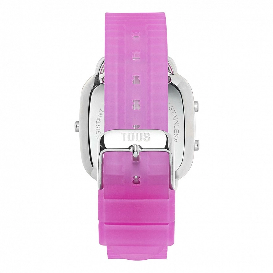 Годинник TOUS D-Logo Fresh з нержавіючої сталі 316L із силіконовим браслетом кольору фуксії. Розміри: 36 x 36 мм з металевим циферблатом. Функції: години, хвилини, секунди, місяць, день, день тижня, 1/100 секундний секундомір і будильник. Водонепроникний при 3АТМ. Акумулятор: 3В літієвий CR2016 / 1,69грам.