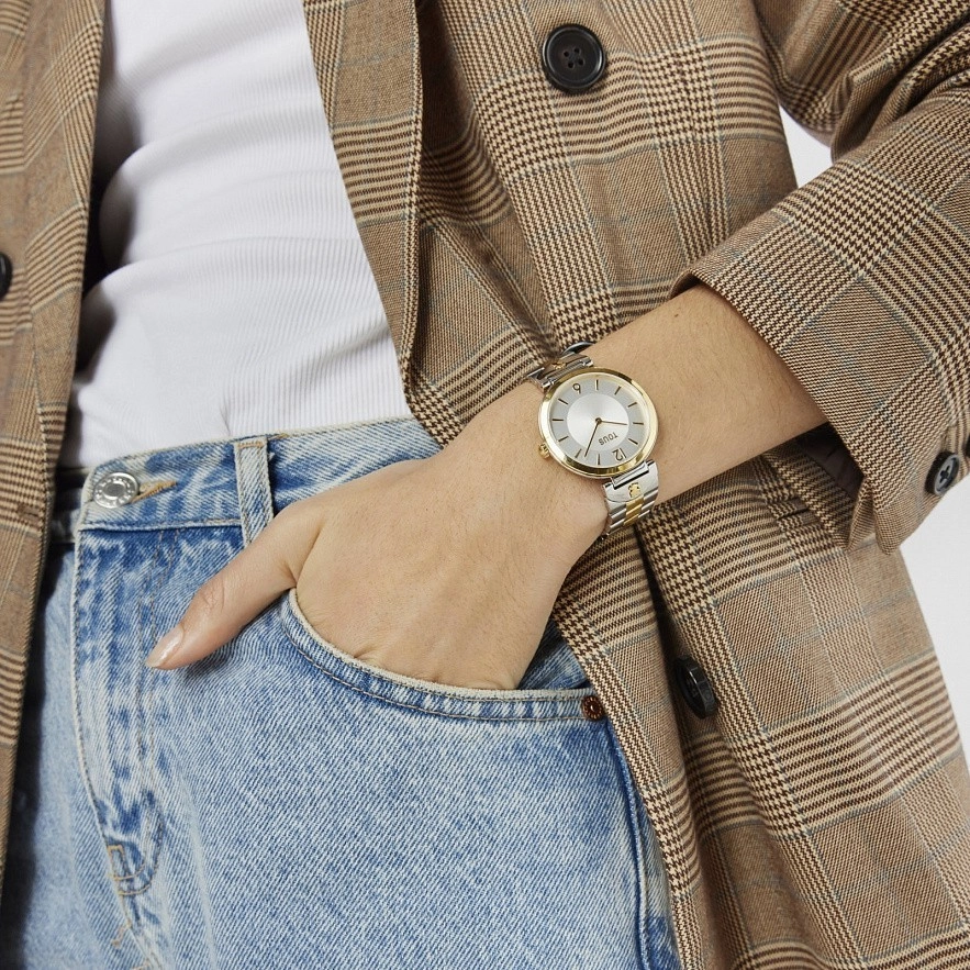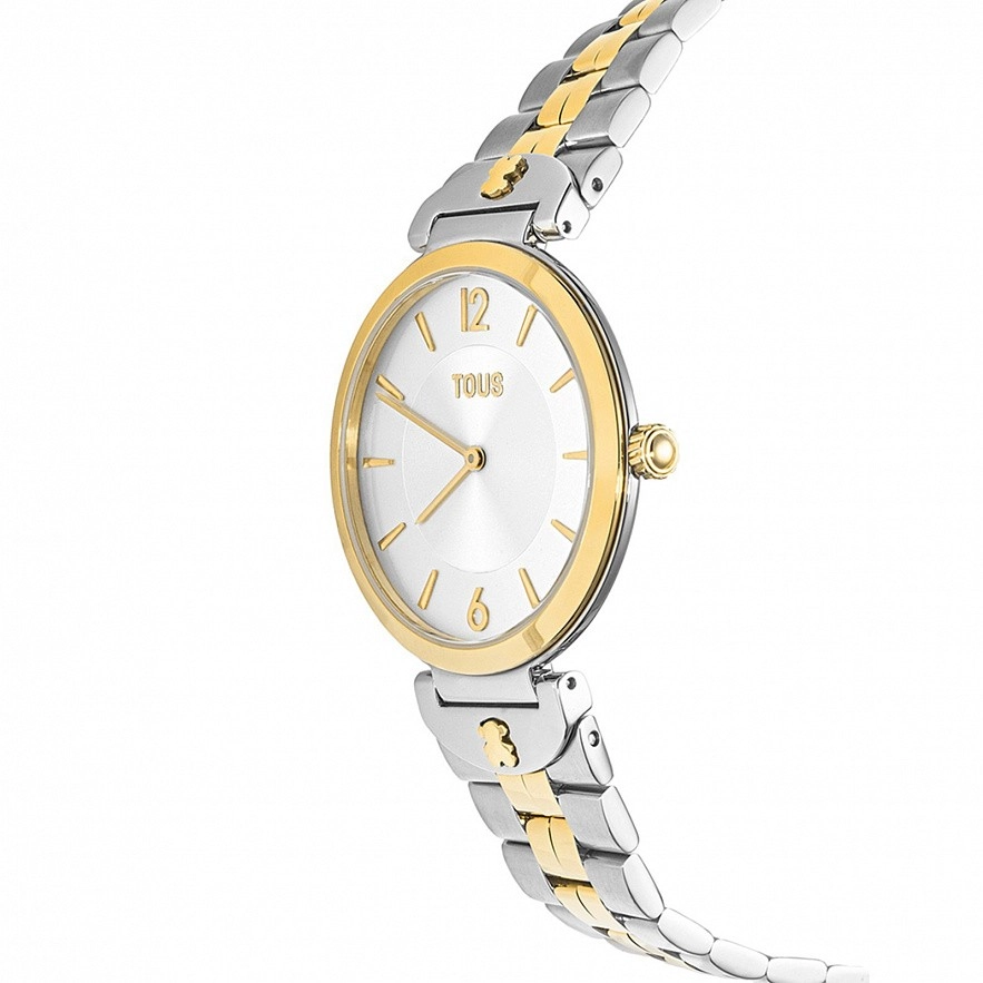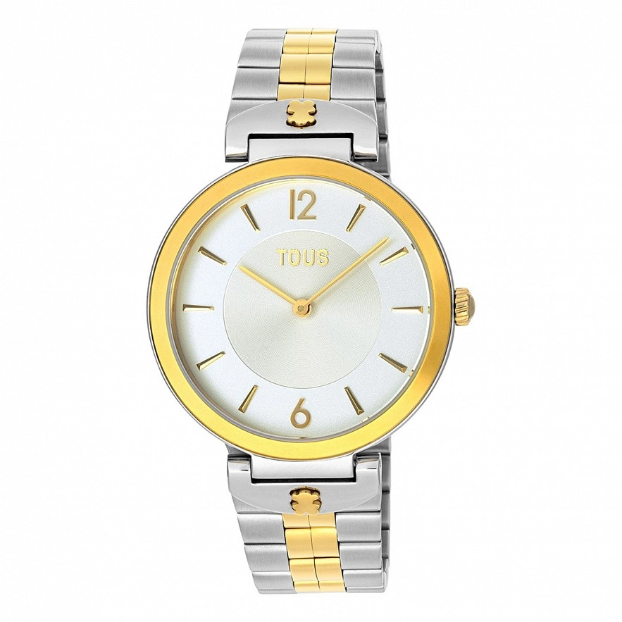 Годинник TOUS S-діапазону зі сталевим браслетом IPG 316L кольору золота, діаметром 36 мм і металевим циферблатом. Функції: години та хвилини. Водонепроникний при 3 АТМ. Акумулятор: 1,55 В, оксид срібла SR621SW / японський кварцевий механізм вагою 0,30 грам. Відкидна застібка з пушерами.