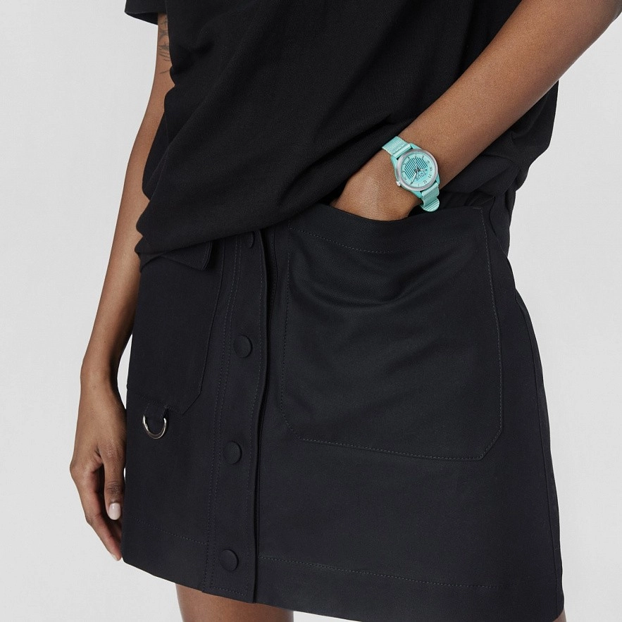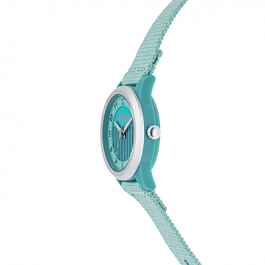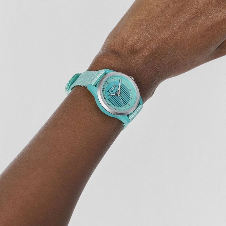 Годинник TOUS Mini Vibrant Sun із м’ятно-зеленим корпусом із переробленого пластику. Ремінець виготовлено з переробленого поліестеру, отриманого з пластикових пляшок. Безель із частково переробленого алюмінію. Функції: години, хвилини та секунди. Водонепроникність: 3 АТМ. Акумулятор: 1,55 В. Діаметр годинника: 30 мм. Японський кварцевий механізм. Застібка-пряжка..