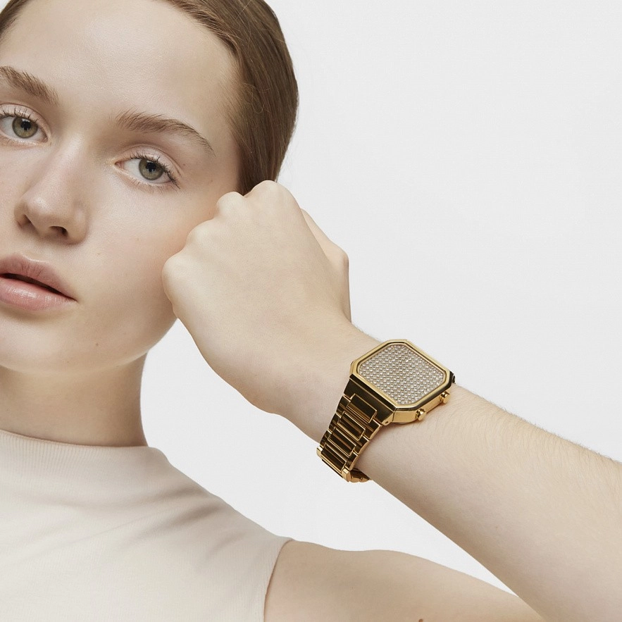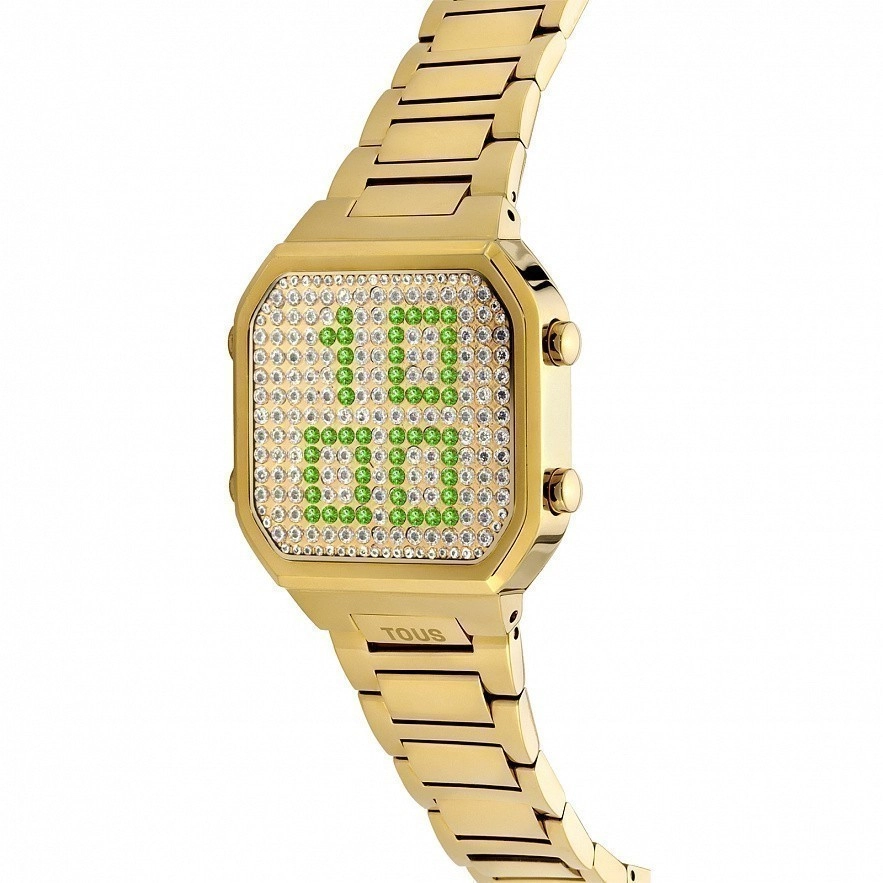 Цифровий годинник TOUS D-BEAR з браслетом зі сталі IPG золотого кольору та корпусом зі світлодіодами. Циферблат з 277 гранованими кристалами та зеленими світлодіодами. Модуль: цифрові світлодіоди. Діаметр корпусу: 36,5 х 44,8 мм. Функції: година, хвилини, дата, місяць, день тижня та іконки. Водонепроникність до 3 ATM. Батарейка: 3 В літієва CR2032 / 2,9 грама (літій 0,03 грама). Калібр: CHENHUI електроніка CH1890. Кришталь: квадратне загартоване пласке скло. Застібка-метелик з кнопками.