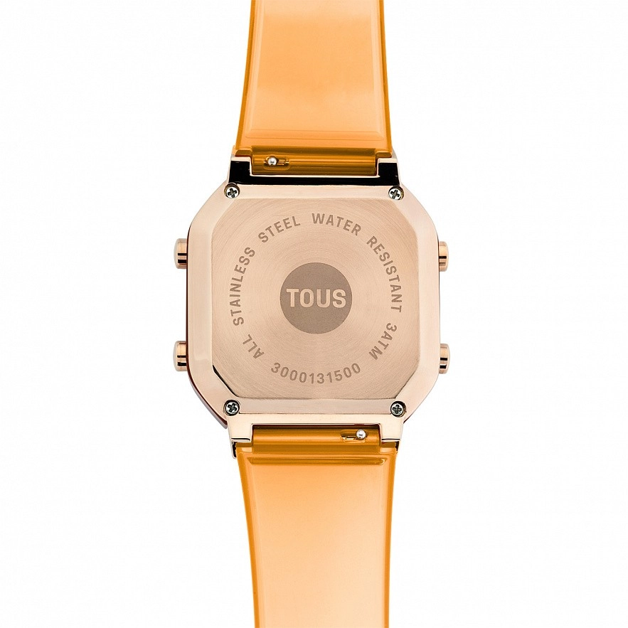 Цифровий годинник TOUS D-BEAR з корпусом і ремінцем з полікарбонату лососевого кольору в поєднанні з деталями зі сталі IPRG рожевого кольору. Циферблат: метал / рідкокристалічний екран (LCD) з підсвічуванням. Діаметр корпусу: 36,5 мм х 46,2 мм. Функції: годинник в 12 або 24-годинному форматі, хвилини, секунди, дата, місяць і день тижня, годинниковий механізм, секундомір 1/100 секунди, таймер зворотного відліку і 5 будильників. Водонепроникний до 3 ATM. Батарейка: 3 В літієва CR2025 / 2,5 грама (літій 0,045 грама). Калібр: CH1892. Кристал: квадратний плаский. Звичайна застібка зі сталевими петлями.