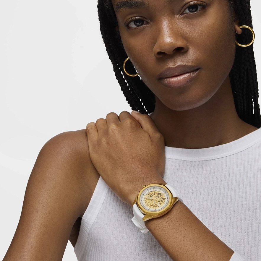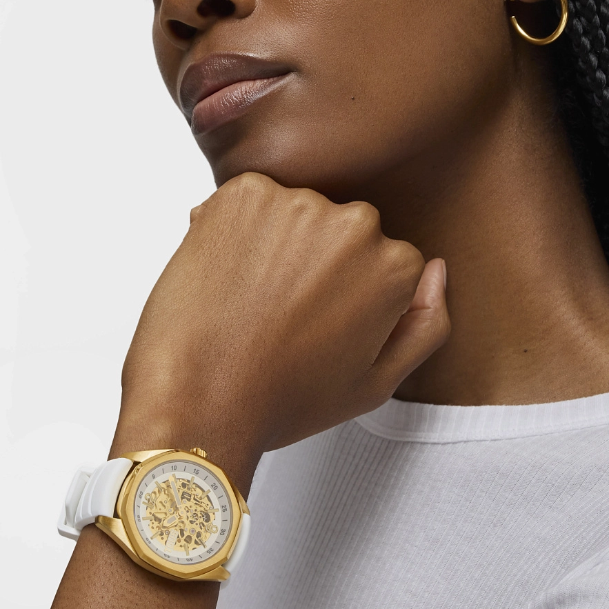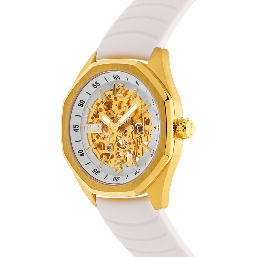 Годинник із золотистим корпусом із сталі з IP-покриттям та білим силіконовим ремінцем TOUS Now. Функції: години та хвилини. Водонепроникний до 10 АТМ. Якщо вам подобається конструкція часу, TOUS Now Skeleton Acero — це ваш безпрограшний вибір. Побачте на власні очі, як працюють внутрішні механізми. Не озирайтесь на минуле, пишіть свою історію і демонструйте її.