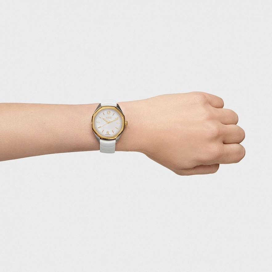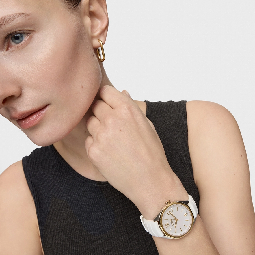 Годинник TOUS Now Lady з білим каучуковим ремінцем. Діаметр: 34,5 мм. Циферблат: перламутровий. Механізм: аналоговий швейцарський кварц. Скло: кругле, пласке сапфірове з антибліковим покриттям. Камені по краях: 5 синтетичних рубінів. Функції: годинник, хвилини і секунди. Водонепроникність до 10 АТМ. Браслет: 16 мм х 16 мм х 70 мм / 16 мм х 16 мм х 110 мм.
