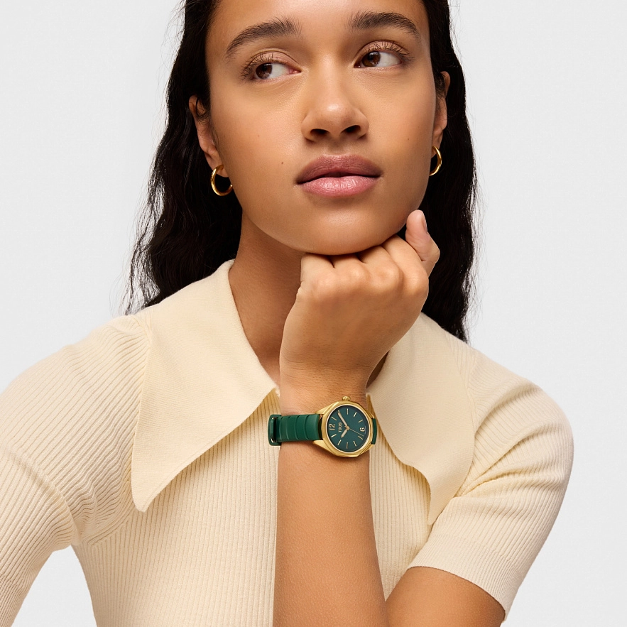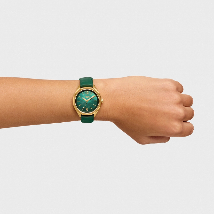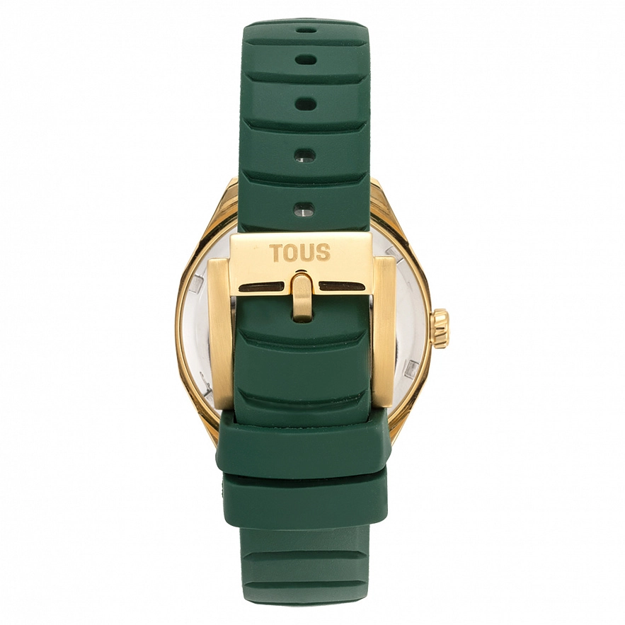 Годинник TOUS Now з зеленим каучуковим ремінцем. Діаметр: 34,5 мм. Циферблат: зелений перламутр. Механізм: аналоговий швейцарський кварц. Скло: кругле, пласке сапфірове з антибліковим покриттям. Камені по краях: 5 синтетичних рубінів. Функції: годинник, хвилини і секунди. Водонепроникність до 10 АТМ. Браслет: 16 мм х 16 мм х 70 мм / 16 мм х 16 мм х 110 мм.