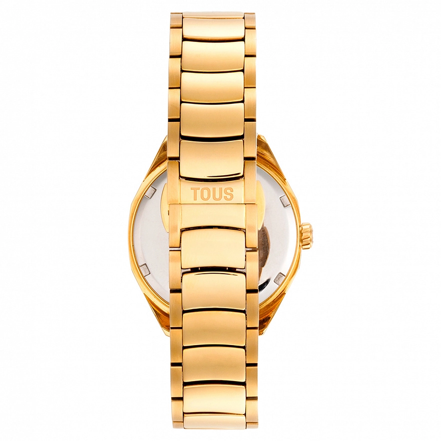 Годинник TOUS Now Lady зі сталевим браслетом золотистого кольору. Діаметр: 34,5 мм. Циферблат: перламутровий. Механізм: аналоговий швейцарський кварц. Скло: кругле, пласке сапфірове з антибліковим покриттям. Камені по краях: 5 синтетичних рубінів. Функції: годинник, хвилини і секунди. Водонепроникність до 10 АТМ. Браслет: 16 мм х 16 мм х 82 мм. Застібка: метелик з кнопками.