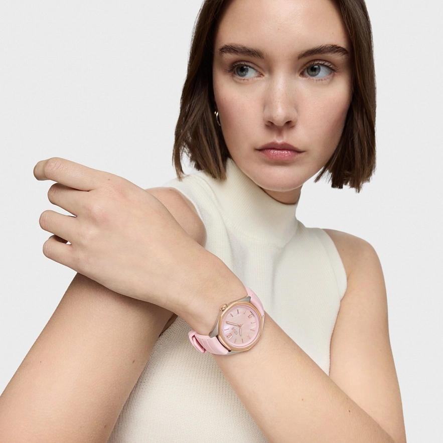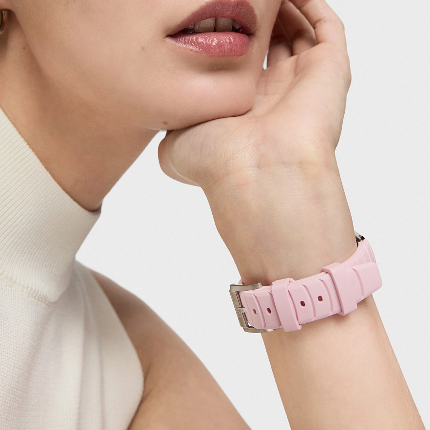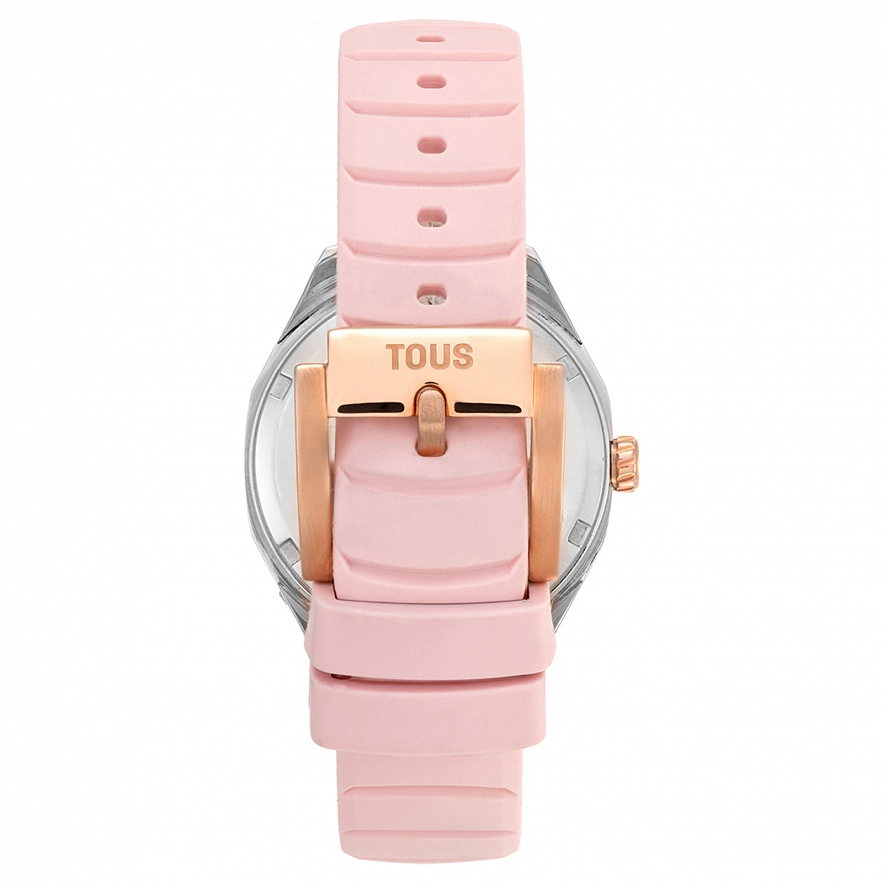 Годинник TOUS Now з рожевим каучуковим ремінцем. Діаметр: 34,5 мм. Циферблат: перламутр рожевого кольору. Механізм: аналоговий швейцарський кварц. Скло: кругле, пласке сапфірове з антибліковим покриттям. Камені по краям : 5 синтетичних рубінів. Функції: години, хвилини, секунди. Водонепроникність до 10 АТМ. Браслет: 16 мм х 16 мм х 70 мм / 16 мм х 16 мм х 110 мм.