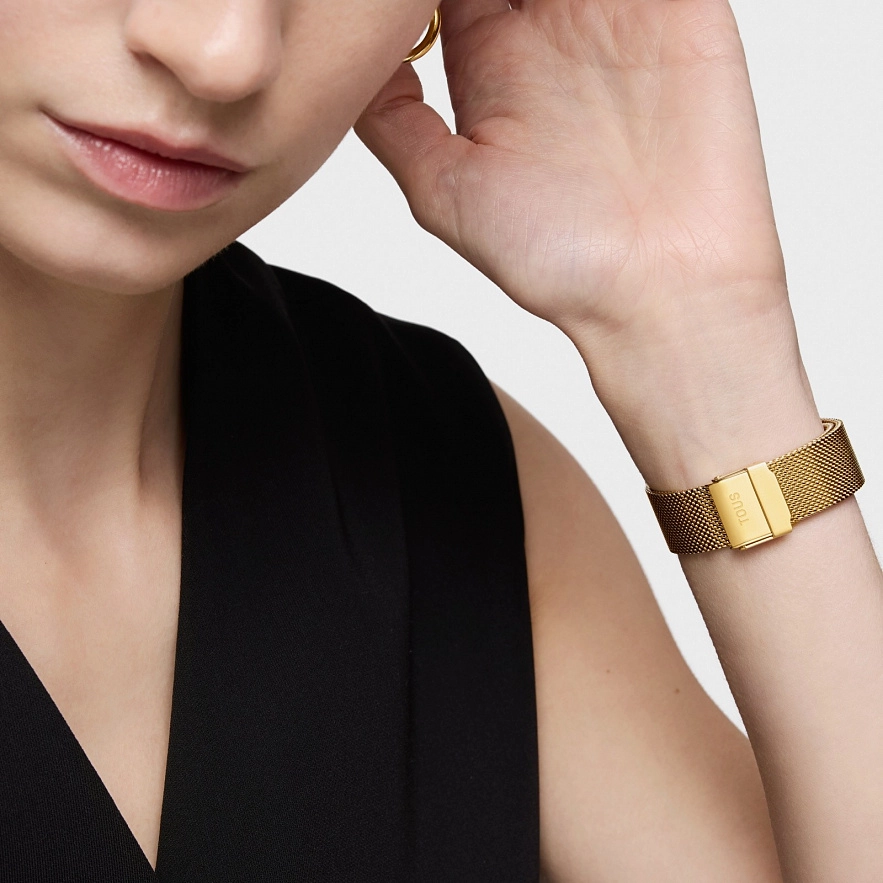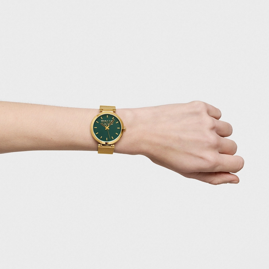 Годинник TOUS S-Mesh Mirror зі сталевим браслетом та сталевим корпусом золотистого кольору. Діаметр корпусу: 36 мм. Циферблат: з ефектом зеленого дзеркала. Функції: годинник, хвилини, секунди. Механізм: аналоговий японський кварц. Водонепроникний: 5 ATM. Браслет: 65 мм х 18 мм х 16 мм / 105 мм х 18 мм х 16 мм. Міланська сітка із захисною застібкою.