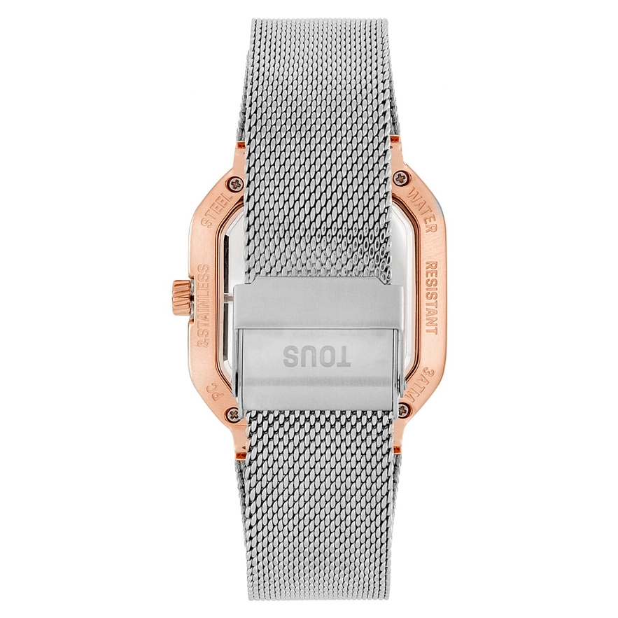 Годинник TOUS D-Bear Party з браслетом з нержавіючої сталі, рожевого кольору та прозорим корпусом. Розміри: 36 мм х 48 мм. Металевий циферблат з акриловим гранованим ведмедиком у стилі дорогоцінного каміння. Скло: плоске, восьмикутне мінеральне скло. Функції: години та хвилини. Водонепроникний до 3 АТМ. Рух: аналоговий японський кварц. Браслет: 23 мм х 18 мм х 74 мм / 23 мм х 18 мм х 105 мм. Міланська сітка із захисною застібкою.