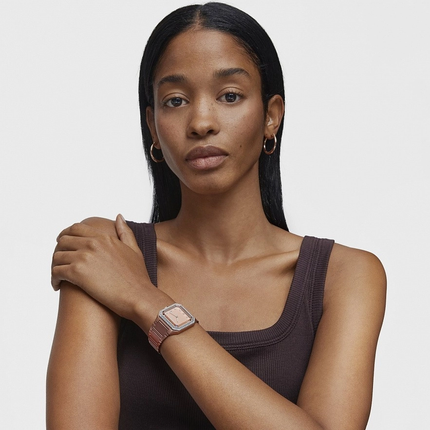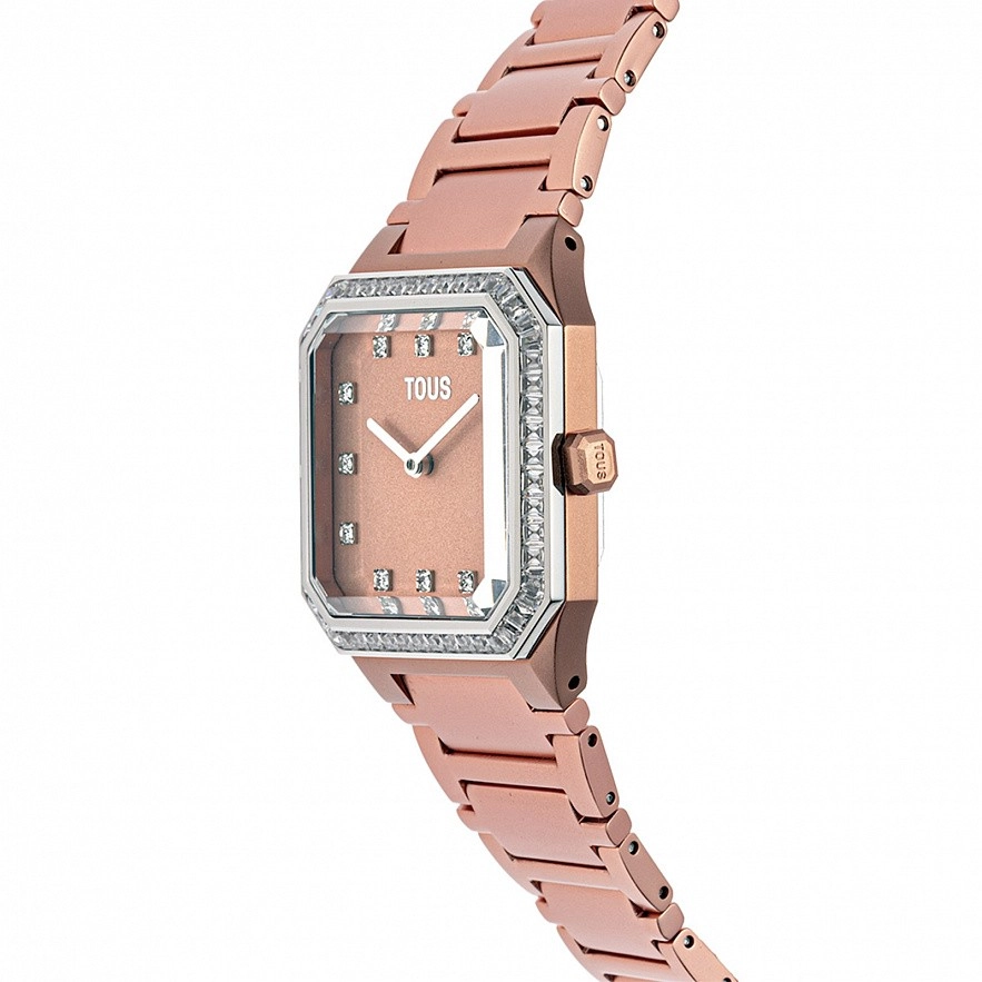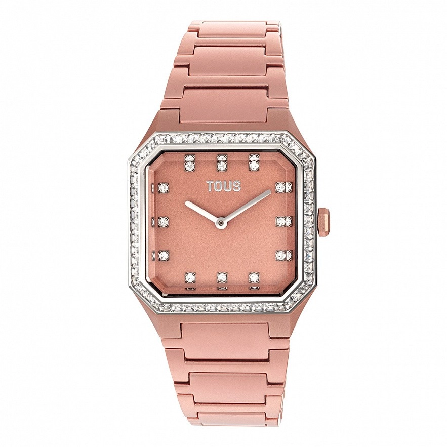 Годинник TOUS Karat Squared зі сталі з покриттям рожевого кольору з алюмінієвим ремінцем. Розміри: 32,2 мм x 39 мм. Металевий циферблат із гранованими кристальними цифрами. Функції: години та хвилини. Водонепроникний при 3АТМ. Акумулятор: 1,55 В, оксид срібла SR626SW / 0,30грам. Японський кварцевий механізм.