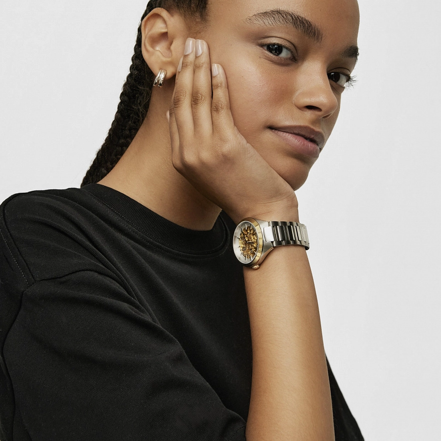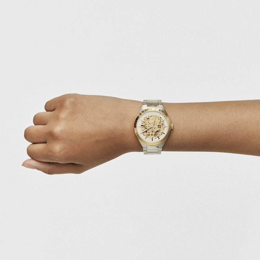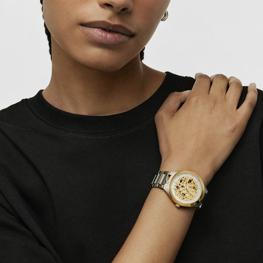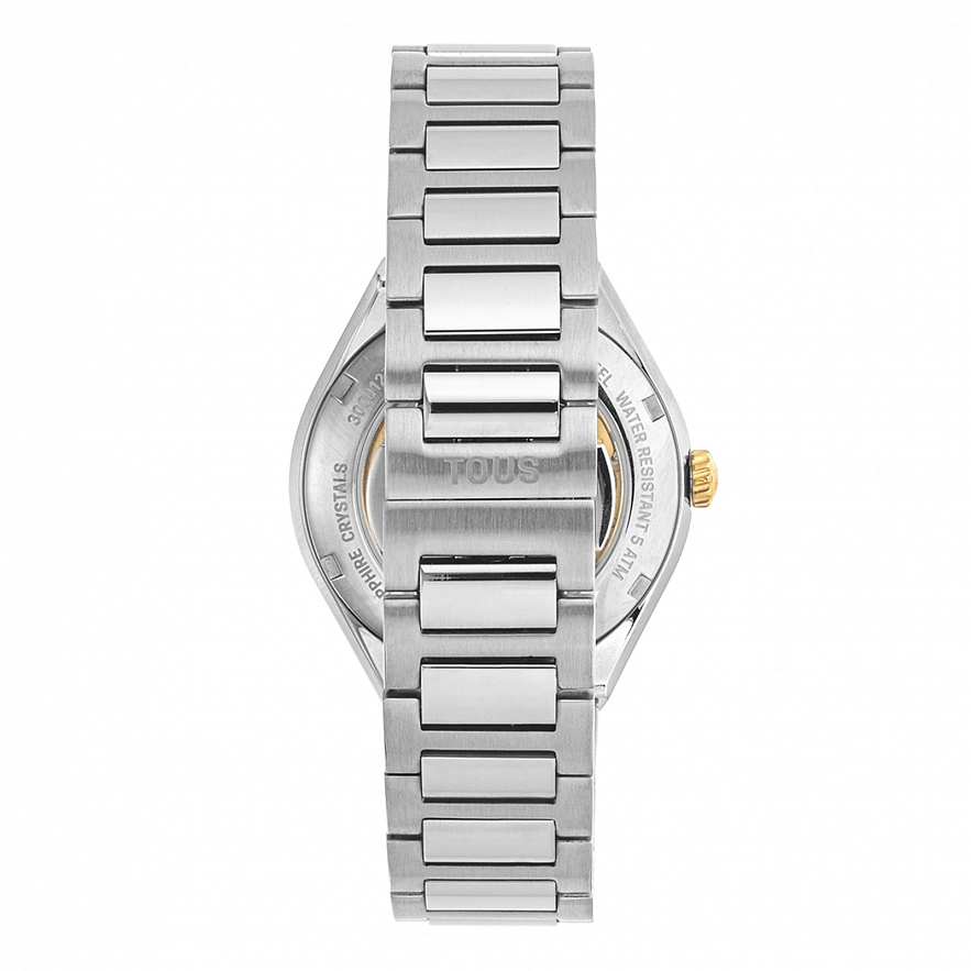 Автоматичний аналоговий годинник TOUS Karat Round зі сталевим ремінцем. Корпус та видимі шестерні зі сталі IPG золотистого кольору. Діаметр: 38 мм. Функції: години та хвилини. Водонепроникність до 5 АТМ. Батарейка: 1,55 В, оксид срібла SR626SW / 0,30 грама. Кругле, пласке сапфірове скло. Автономність: 42 години. Автоматичний механічний рух, японський скелетон. Застібка-метелик з кнопками.