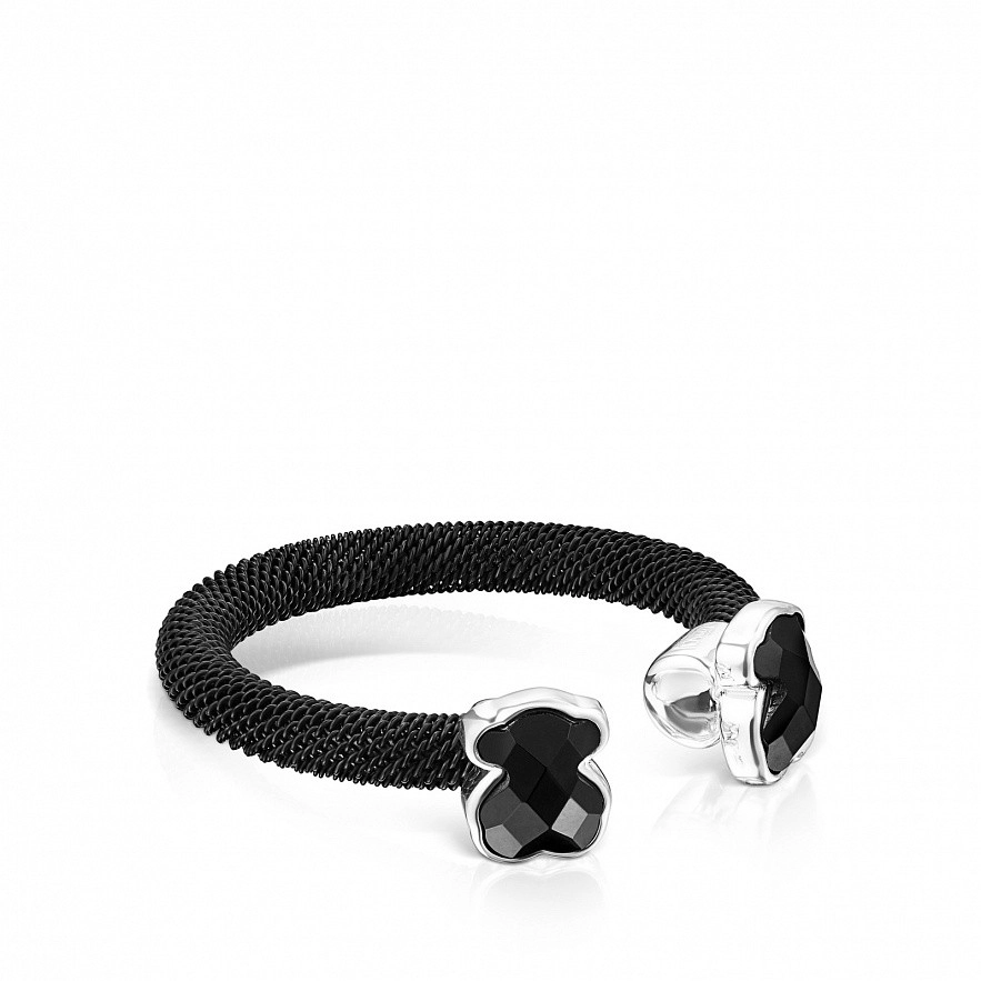 Каблучка TOUS Mesh Color зі сталі з чорним іонним напиленням , вставкою з оніксу у вигляді ведмедика, обрамленою сріблом. Розмір вставки: 0,6 см. Ширина каблучки: 0,3 см.