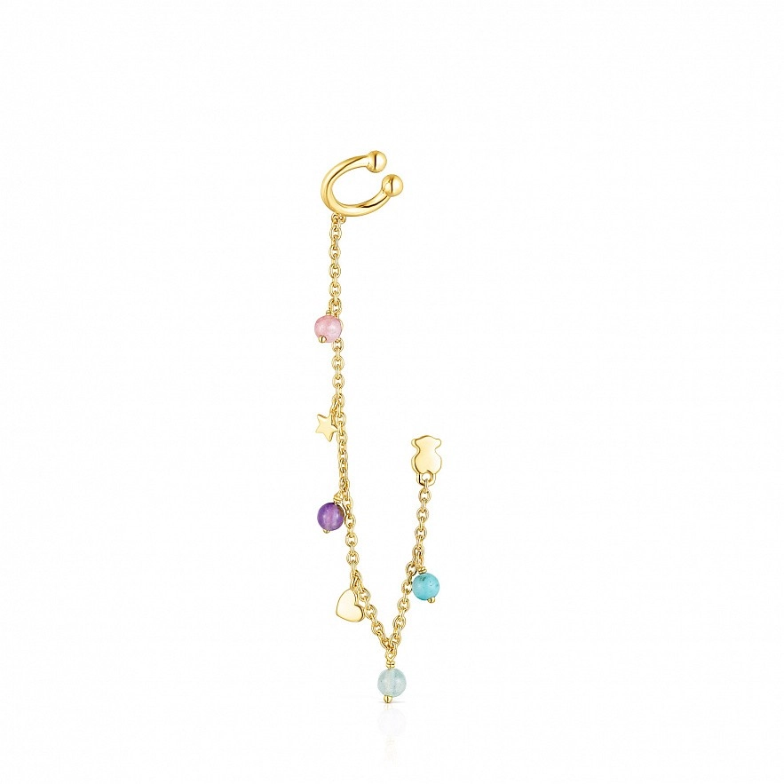 Кафа на одне вухо TOUS Cool Joy із срібла 925 проби з покриттям Vermeil . Підвіски - символи: зірка, серце, ведмідь розміром 0.35 - 0.45 см та дорогоцінне каміння: аметист, авантюрин, гауліт, родохрозит діаметром 0 .28 -0.32 см та перлинами діаметром 0.3 см. Довжина ланцюжка на сережці - 9 см. Даметр кільця для фіксації - 0.95 см.Застібка - пусет.Vermeil : срібло з покриттям золота 18 карат.
