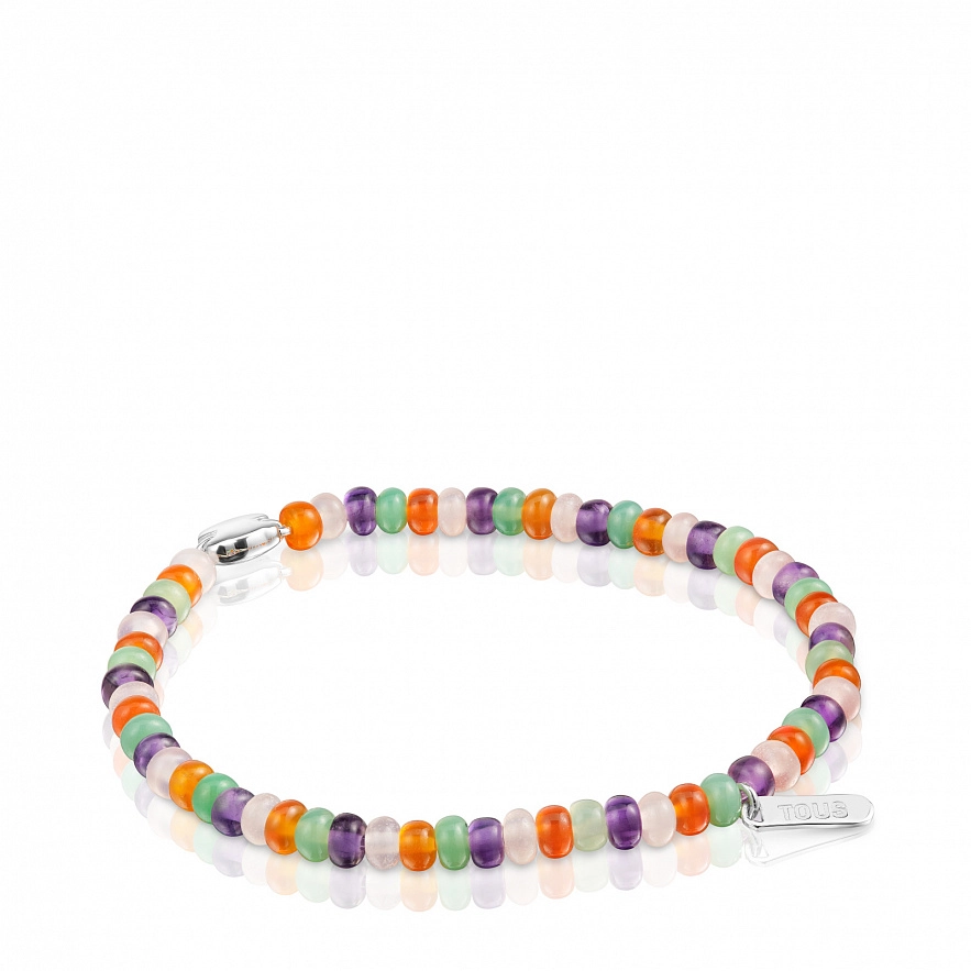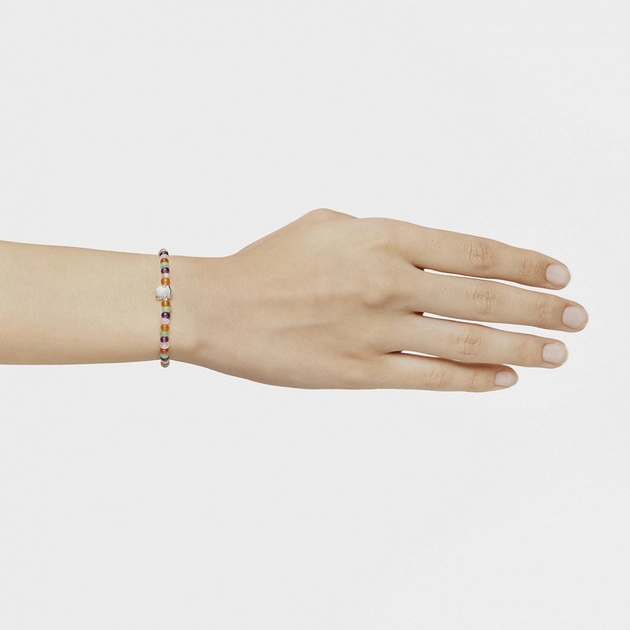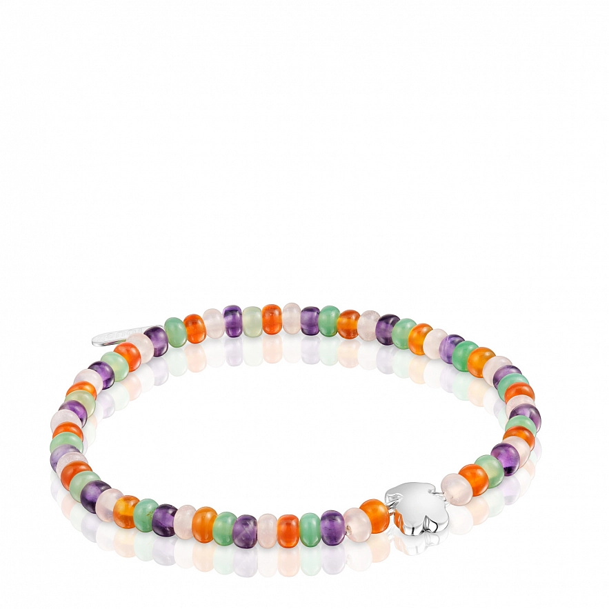 Еластичний браслет TOUS Bold Motif з дорогоцінними каменями та мотивом ведмедика зі срібла 925 проби. Оброблені камені: аметист, зелений халцедон, рожевий халцедон та помаранчевий халцедон. Розмір дорогоцінних каменів: 4 х 2 мм. Розмір ведмедика: 8 мм. Довжина браслету: 16,5 см.