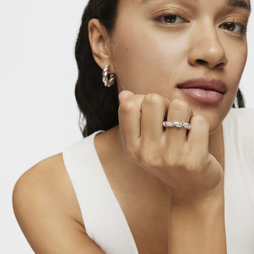 Каблучка TOUS Twisted зі срібла 925 проби з кульками-шармами у формі спіралі. Товщина каблучки: 5 мм.