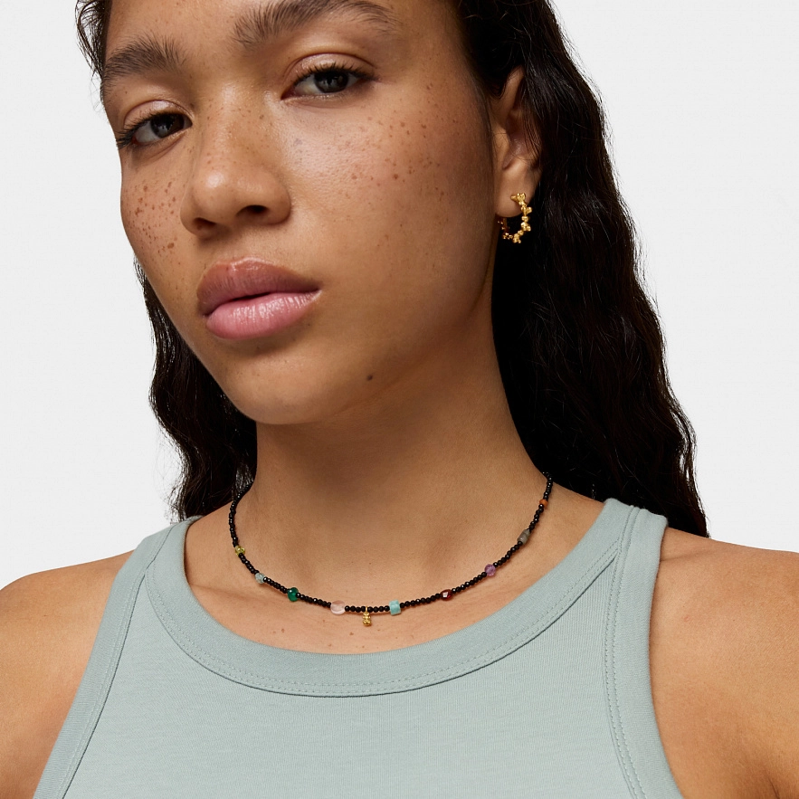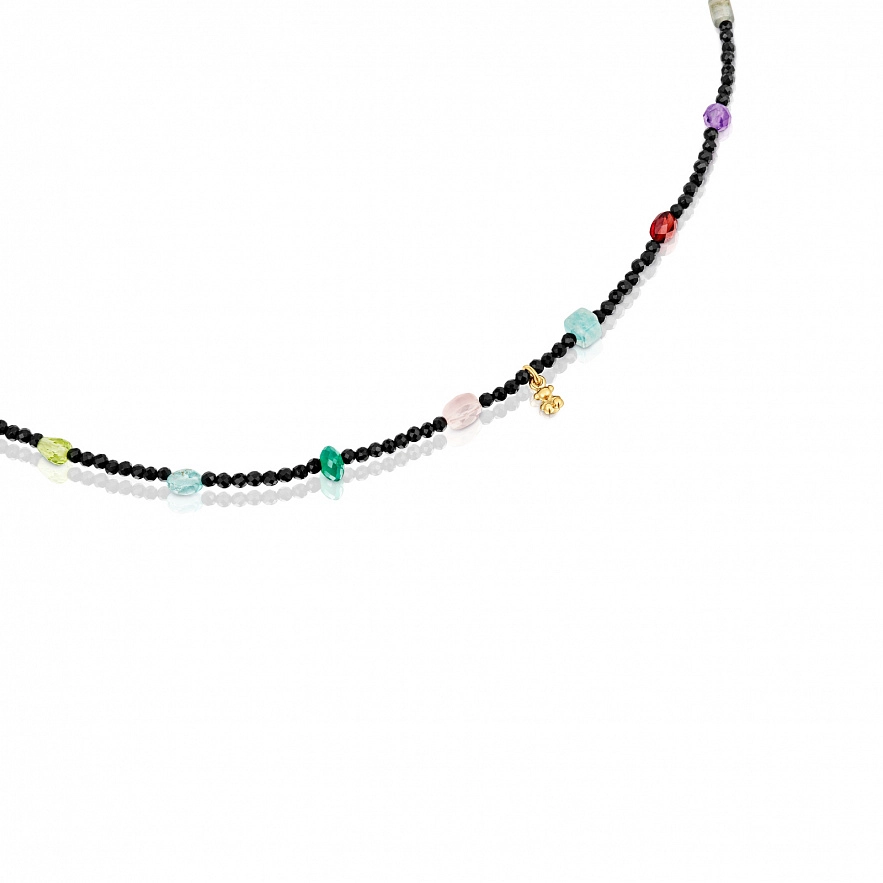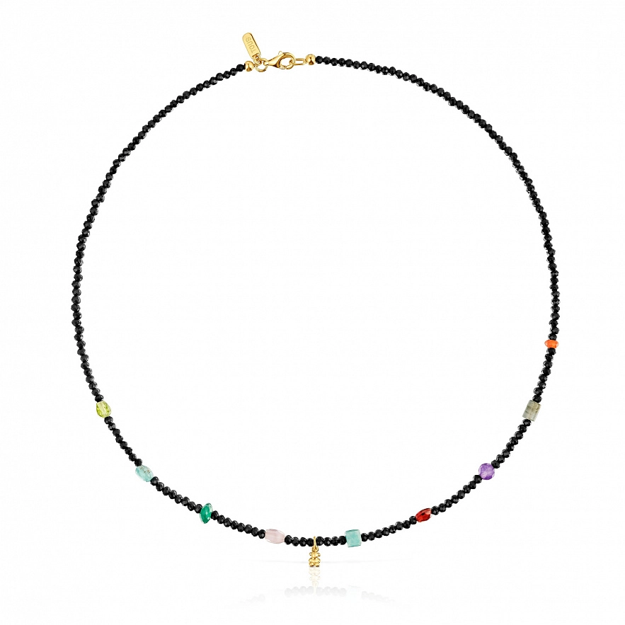 Намисто TOUS Bold Bear зі срібла 925 проби з покриттям Vermeil , оніксу та дорогоцінним камінням. Ограновані камені: онікс 2-2,5 мм, гранат 5 мм, амазоніт 4 мм, рожевий кварц 5 мм, халцедон 5 мм, апатит 5,5 мм і перидот 4 мм. Розмір ведмедика: 4 мм. Загальна довжина: 42 см. Застібка у вигляді лобстера.