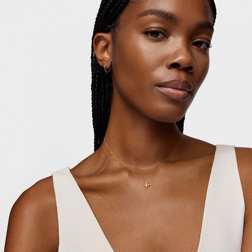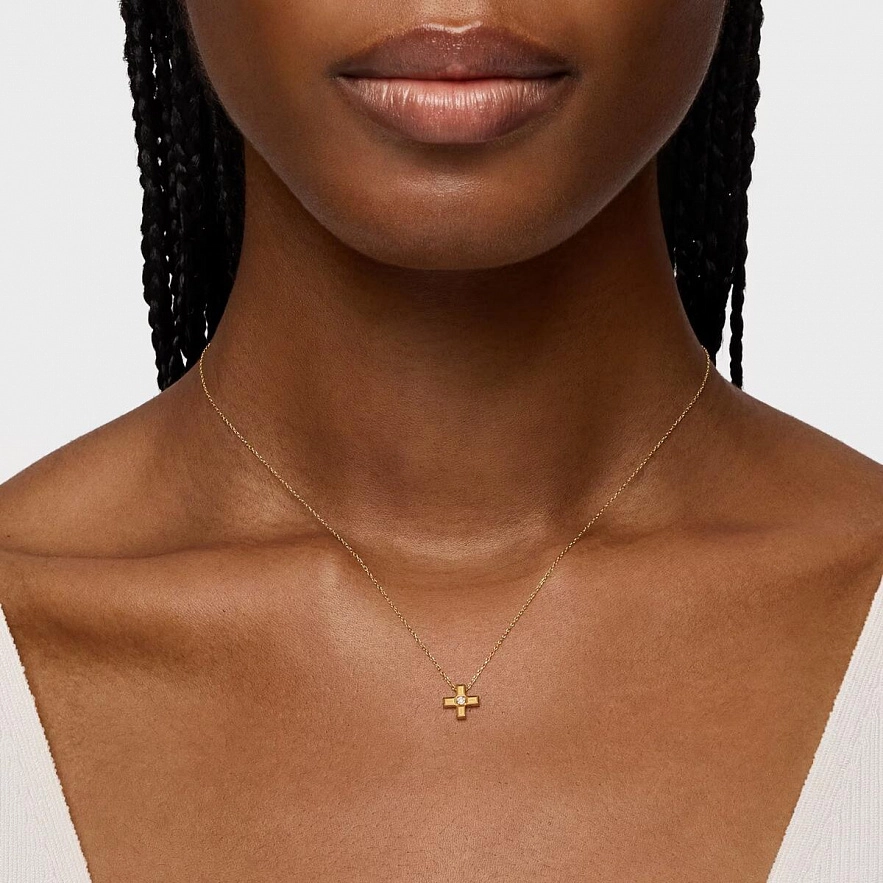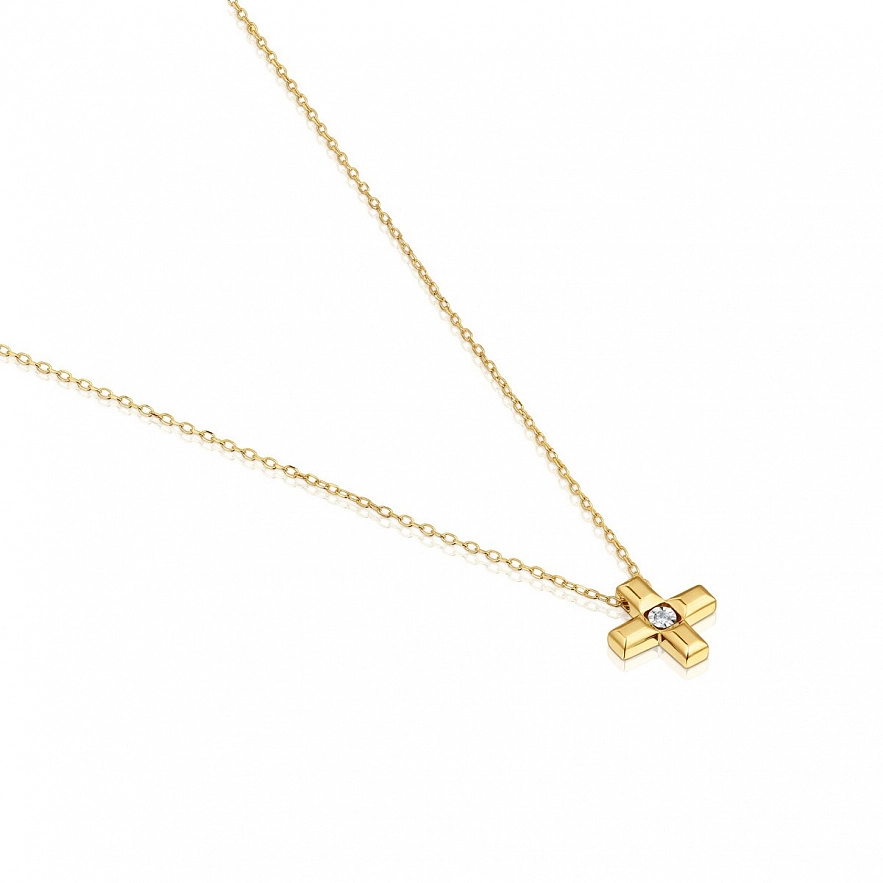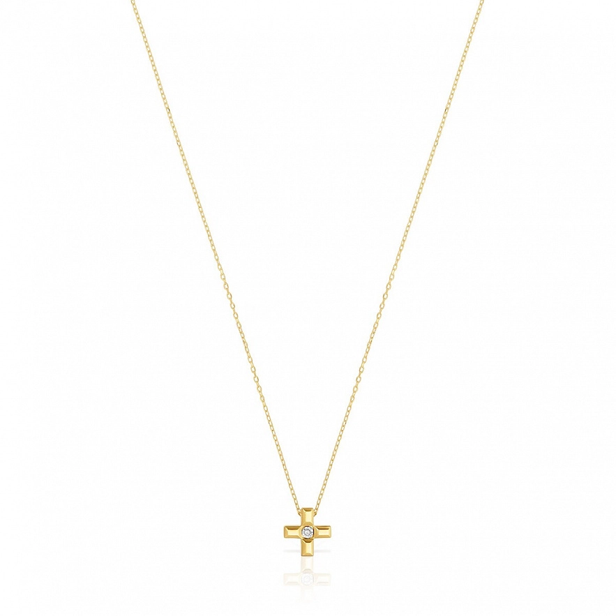 Намисто TOUS Basics з жовтого золота 18 карат з кулоном хрестиком та діамантами огранювання 0,005 карата. Розмір мотиву: 8 мм. Якість діамантів: H/SI. Довжина намиста: 45 см. Застібка-лобстер.