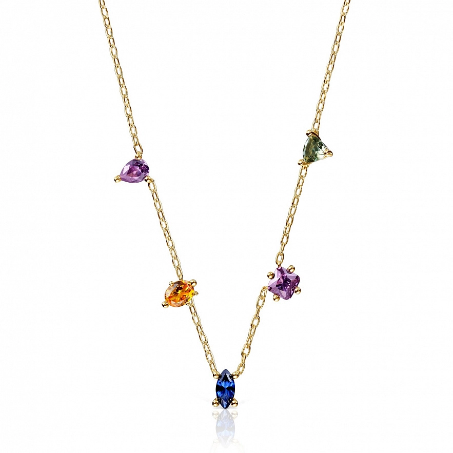 Намисто TOUS Color Lab зі срібла 925 проби з покриттям Vermeil , огранений синтетичний сапфір: синього, бузкового кольору, жовтого кольору; огранена синтетична шпінель зеленого кольору вирощена в лабараторії. Довжина намиста: 45 см. Застібка-лобстер. Примітка: Виріб створено з використанням лабораторно вирощених дорогоцінних каменів.