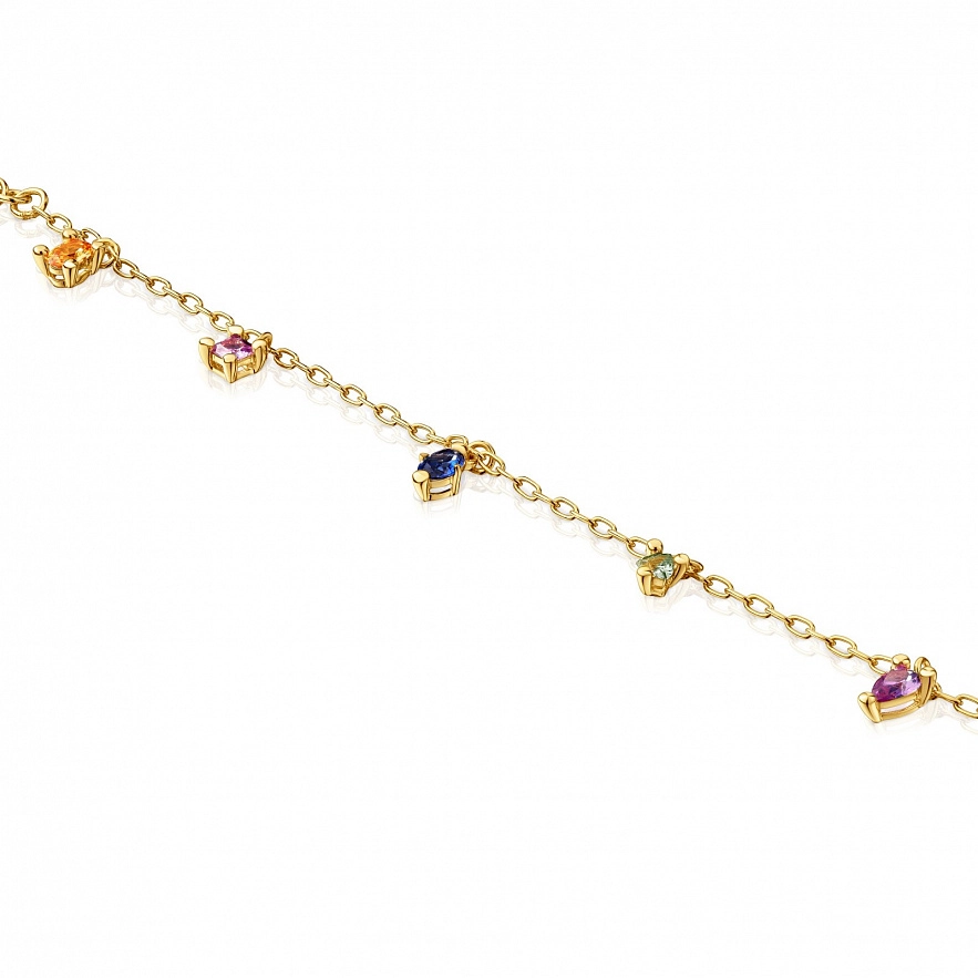 Браслет TOUS Color Lab зі срібла 925 проби з покриттям Vermeil , синтетичний сапфір жовтого, бузкового та синього кольору, з овальним огранюванням вирощені в лабораторії. Розміри каменів: синтетичний цитрин 14 х 14 х 6,5 мм, синтетична шпінель 16 х 10 х 6,5 мм. Довжина браслета: 25 см. Застібка з лобстера. Примітка: Виріб створено з використанням лабораторно вирощених дорогоцінних каменів.