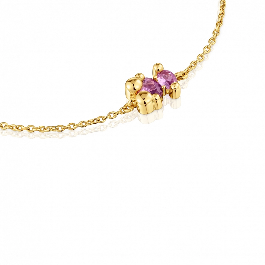 Браслет TOUS Color Bear LGG зі срібла 925 проби з покриттям Vermeil та огранованим сапфіром бузкового кольору у формі ведмедика, вирощеним у лабораторії. Розмір мотиву: 8 мм. Довжина браслета: 25,5 см. Застібка-слайдер. Примітка: Виріб створено з використанням лабораторно вирощених дорогоцінних каменів.