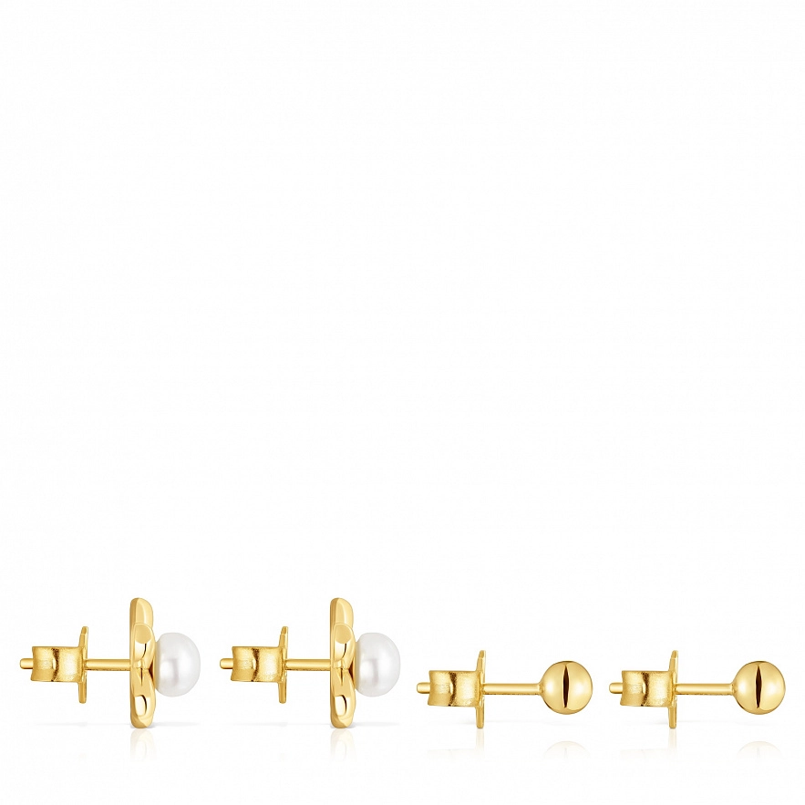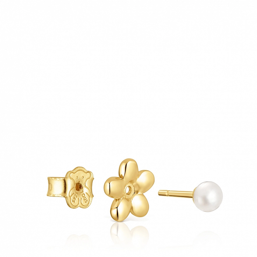 Набір сережок TOUS Virtual Garden зі срібла 925 проби з покриттям Vermeil та культивованими перлами. Основа сережки у формі квітки без застібки; взаємозамінні між двома різновидами сережок. Одна сережка у формі кульки з 18-каратним золотим покриттям, а інша пара з культивованою прісноводною перлиною. Розмір культивованих перлин: 3.2 мм. Розмір шарму: 3,2 мм.