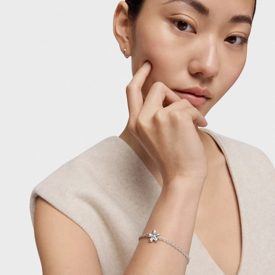 Браслет TOUS Daisy зі срібла 925 проби з квітковим мотивом. Розмір мотиву: 12 мм. Довжина браслета: 17,5 см. Застібка-метелик.