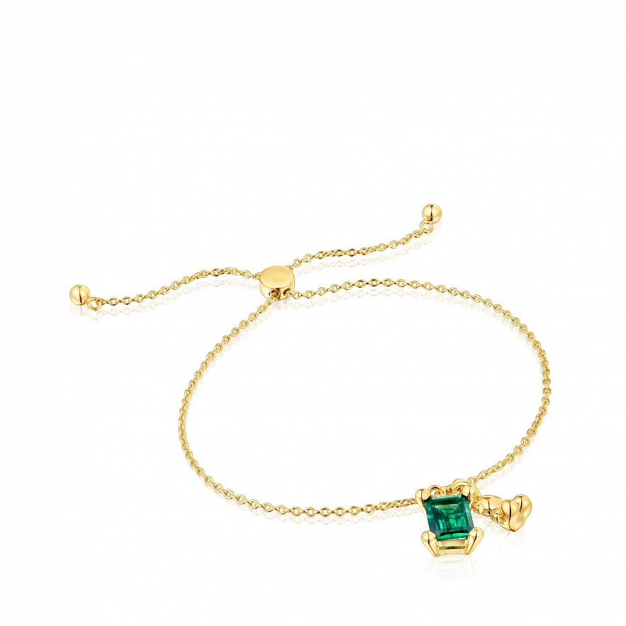 Браслет TOUS Bold Bear LGG зі срібла 925 проби з покриттям Vermeil з огранованим восьмигранним синтетичним зеленим смарагдом. Розмір дорогоцінного каменю: 8 мм. Розмір ведмедика: 7 мм. Загальна довжина браслета: 23 см. Застібка-слайдер. Примітка: Виріб створено з використанням лабораторно вирощених дорогоцінних каменів.