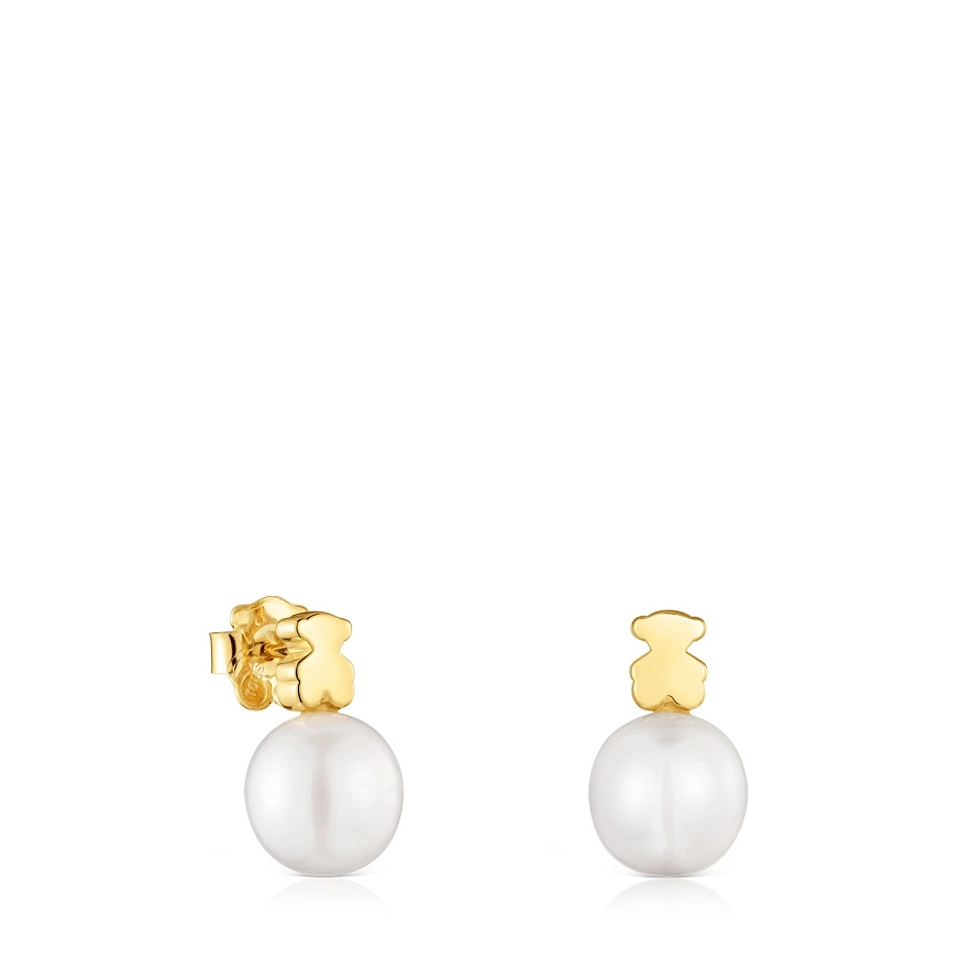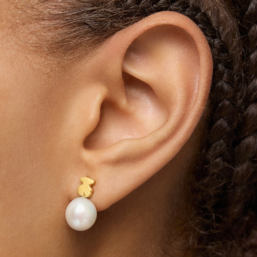 Сережки TOUS Sweet Dolls з 18-каратного жовтого золота з мотивом ведмедика та культивованою прісноводною перлиною. Розмір ведмедика: 6 мм. Розмір культивованої перлини: 9 мм. Застібка-пусет.