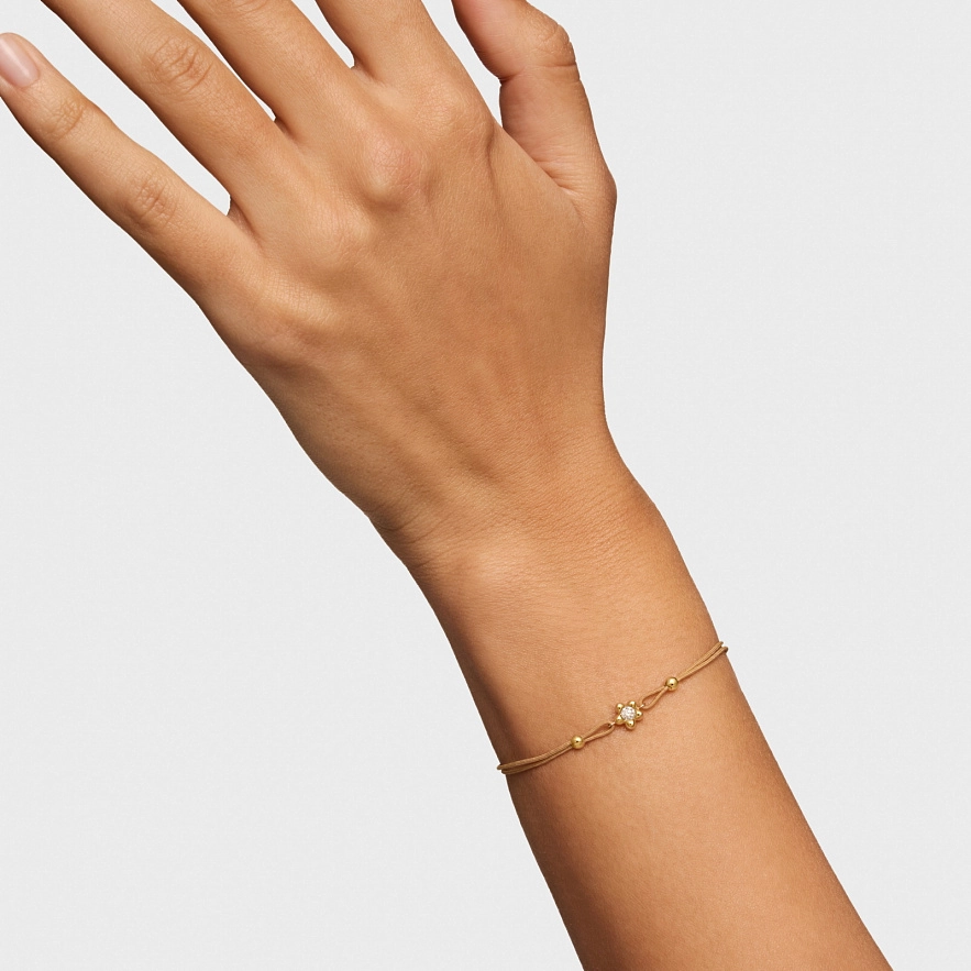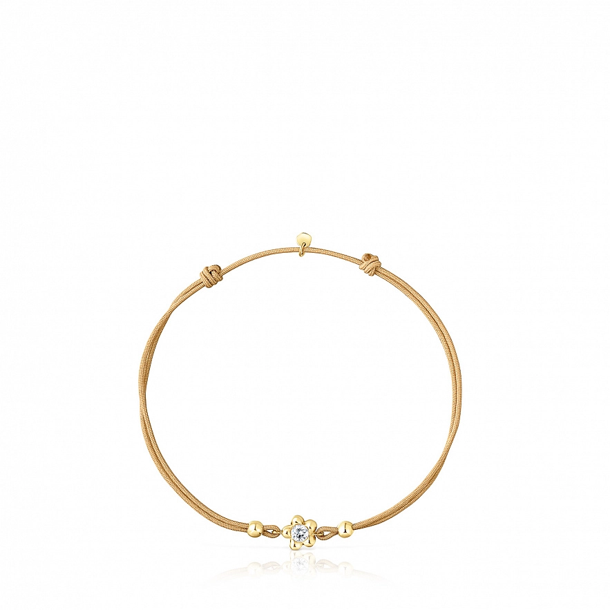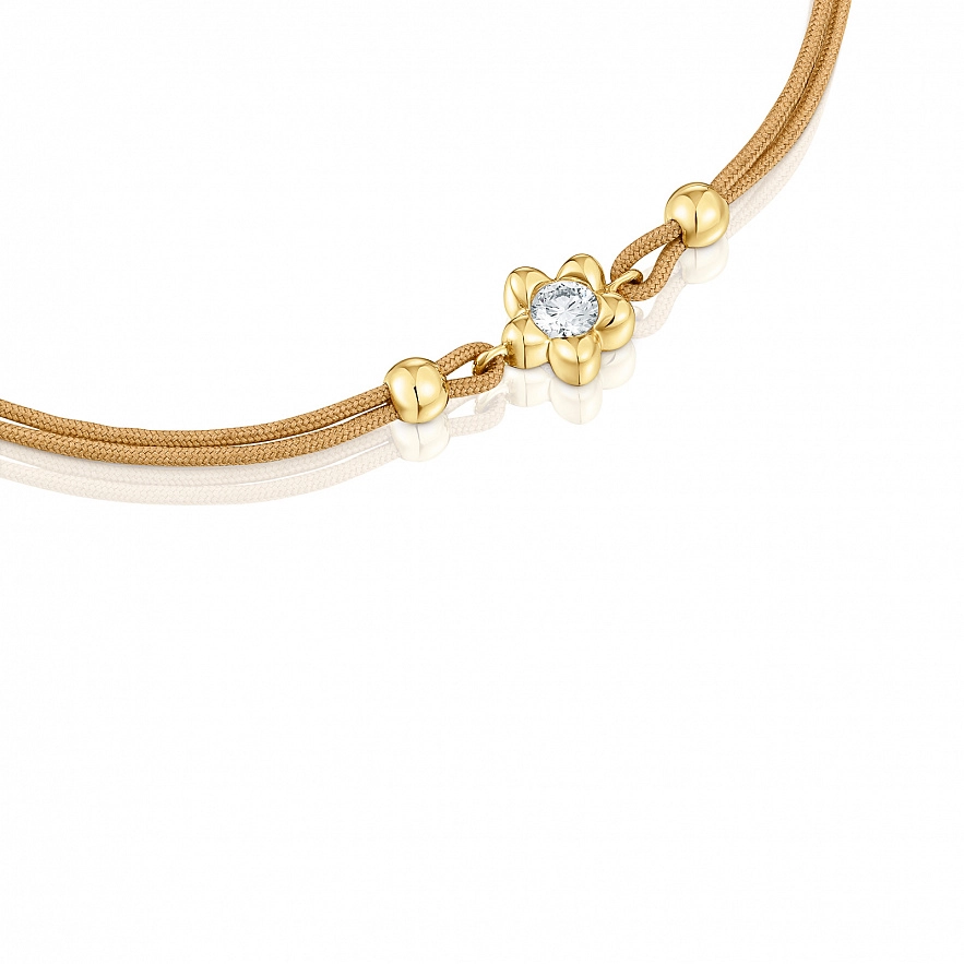 Браслет TOUS Lili Motives LGD з квітковим мотивом з жовтого золота 14 карат та з діамантом 0.10 карата вирощеним в лабораторії, і нейлоном пісочного кольору. Якість діаманта: G/VS. Розмір мотиву: 6 мм. Довжина браслета: 17 см. Якість діамантів: G/VS. Застібка-слайдер. Виріб створений з діамантами, вирощеними в лабораторії. Tracemark гарантує простежуваність усіх матеріалів, які йдуть на виготовлення цього виробу, а також місце його виробництва, і має документальне підтвердження цього.