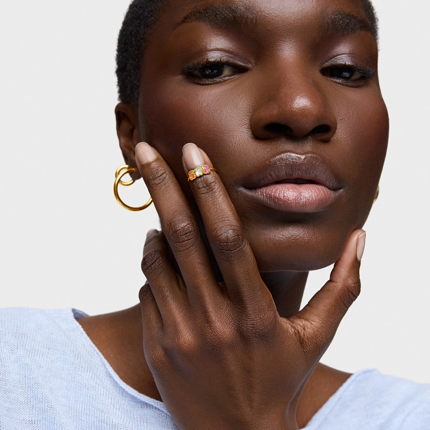Каблучка TOUS Icon Color LGG зі срібла 925 проби з покриттям Vermeil , лабораторно вирощеним рубіном, м'ятно-зеленим і помаранчевим сапфіром у формі ведмедика. Розмір ведмедиків: 4 мм. Один розмір. Виріб створений з використанням лабораторно вирощених дорогоцінних каменів.
