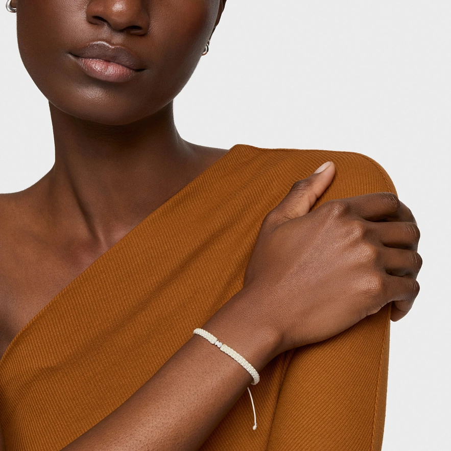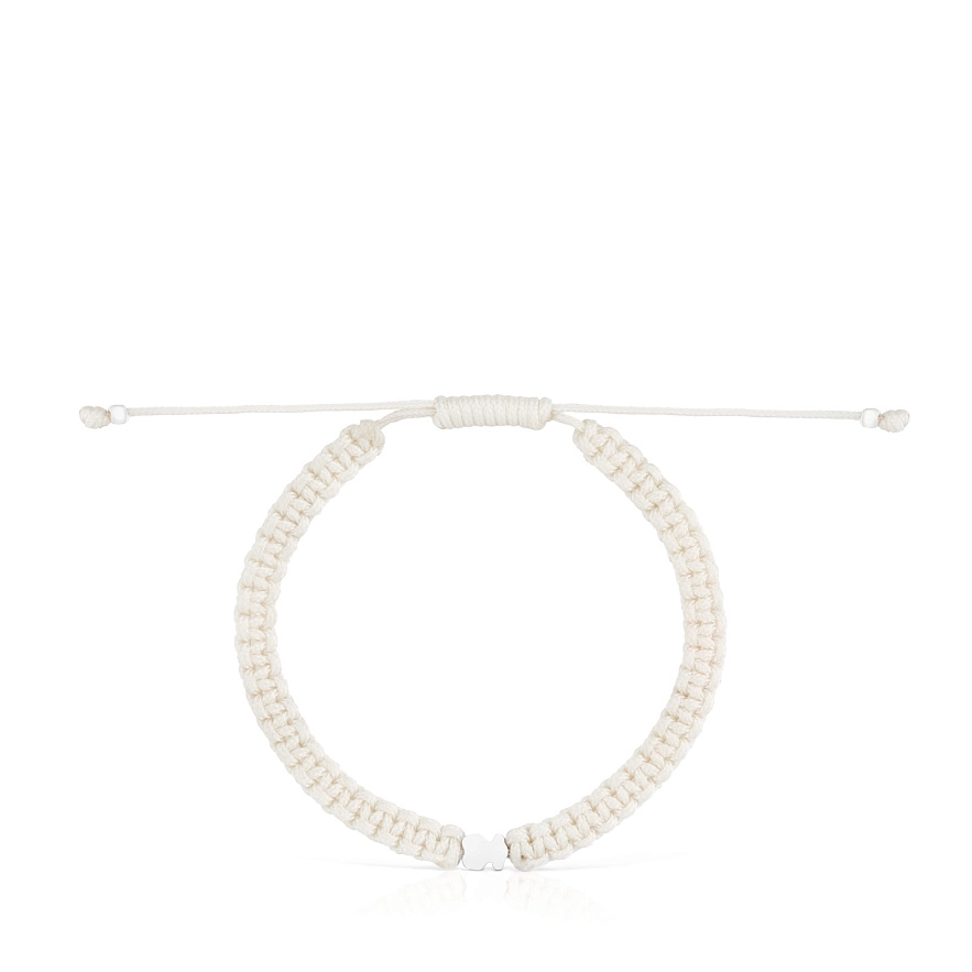 Браслет TOUS Motifs зі срібла 925 проби із мотивом ведмедика та білим нейлоном. Довжина браслета: 17 см. Застібка-слайдер.