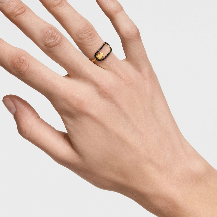 Каблучка TOUS Camille зі срібла 925 проби з 18-каратним золотим покриттям та фасетованими круглими шпінелями чорного кольору з мотивом ведмедя. Розмір мотиву: 15 мм. Виріб виготовлений зі срібла 925 проби з 18-23-каратним золотим покриттям товщиною 3 мікрони. Така якість гарантує більшу довговічність прикраси.