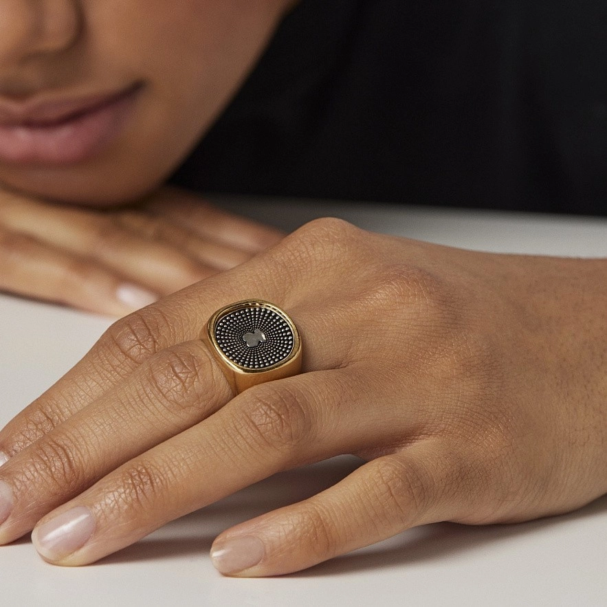 Каблучка TOUS Oursin зі срібла 925 проби з покриттям Vermeil з ведмедиком зі срібла 925 проби та чорної емалі. Розмір каблучки: 19мм. Каблучка виготовлена із стерлінгового срібла 925 проби, яке покрите золотом 18 карат товщиною від 3 до 5 мікрон. Ця якість гарантує більшу довговічність коштовності. Техніка виготовлення: лиття.