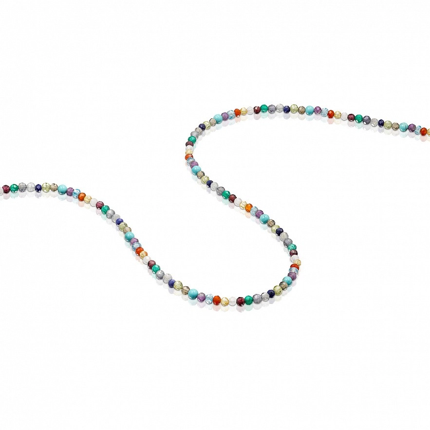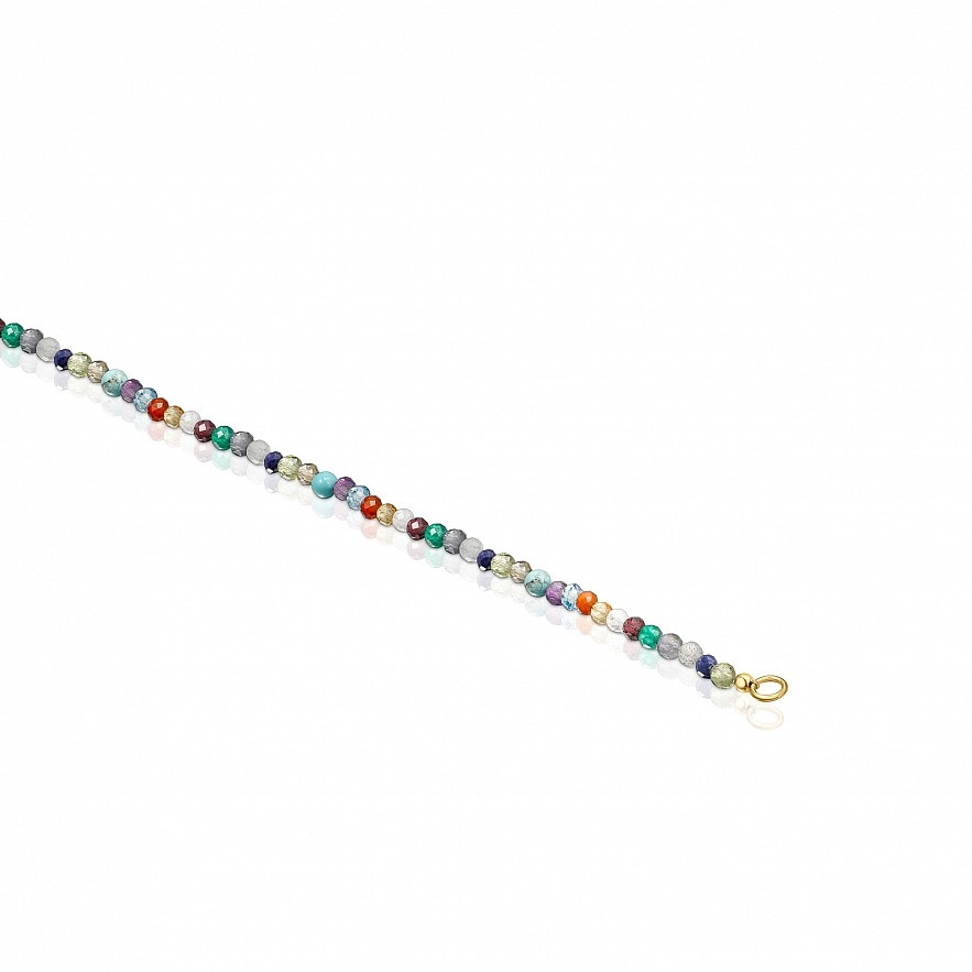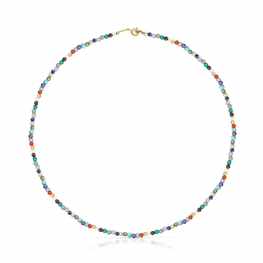 НамистоTOUS Good Vibes зі срібла 925 проби з покриттям Vermeil з огранованими кульками з аметисту, блакитного топазу, сердоліку, цитрину, гірського кришталю, граната, хризопразу, іоліта, лабрадориту, лазуриту, перидота, раухтопазу 3,2 мм та гладкоъ кульки з бірюзи 3,5 мм. Довжина кольє-чокера: 45 см. Vermeil : срібло з покриттям золота 18 карат.